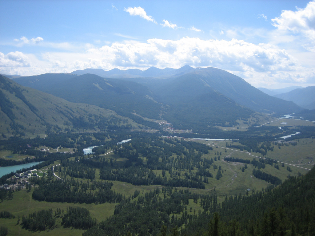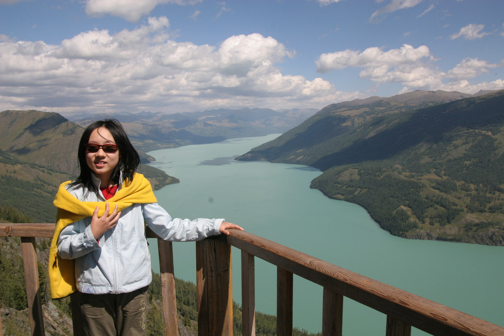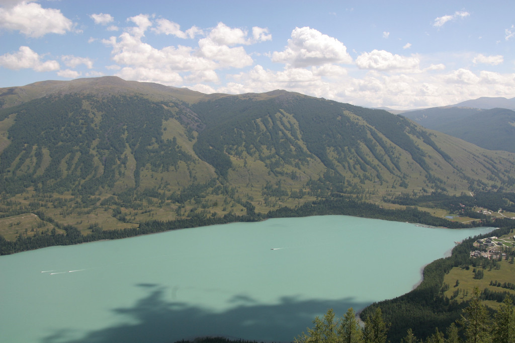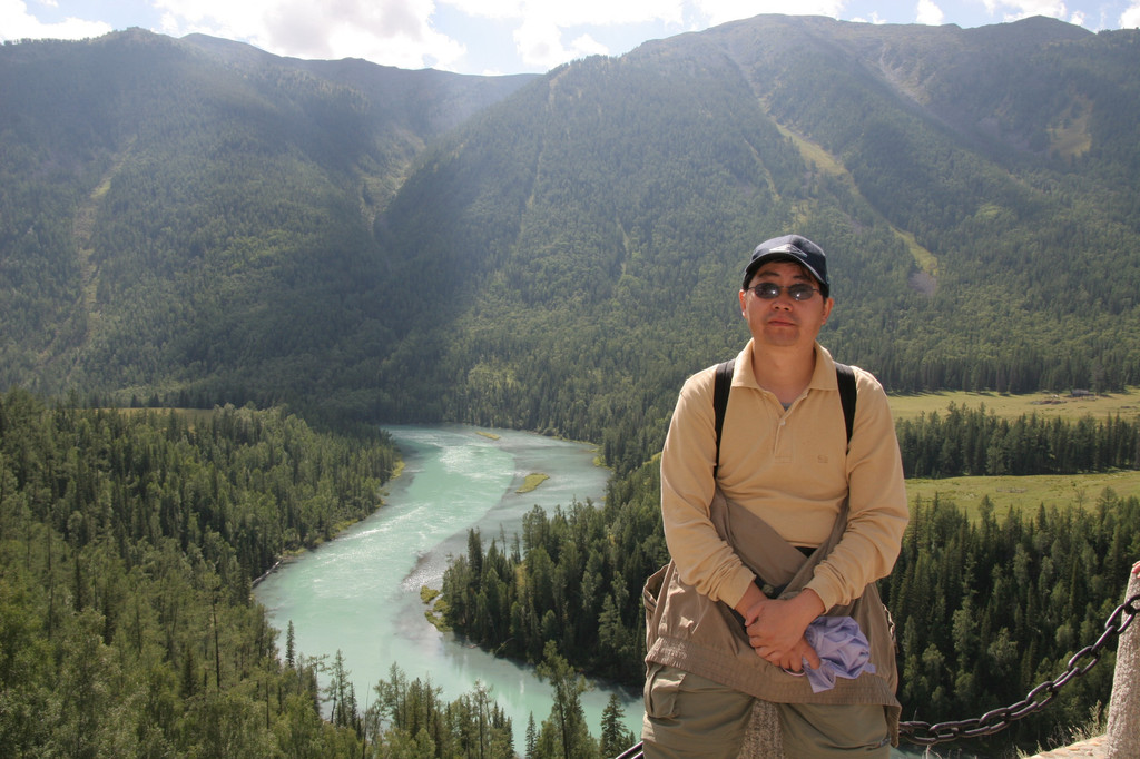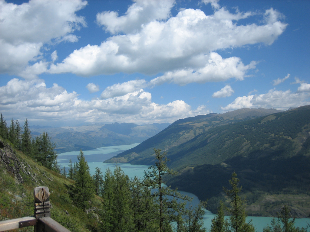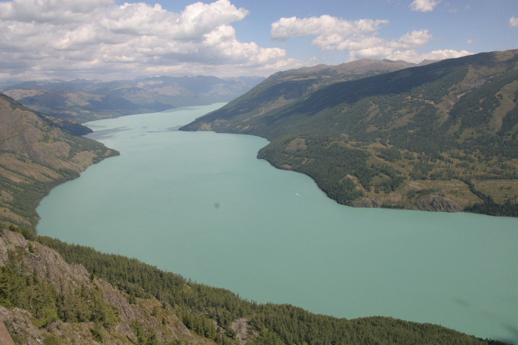 经过半个多小时的攀登终于登上了“观鱼亭”。俯瞰整个喀纳斯湖,确实美极了。蓝色的湖水,映村着巍峨的青山;高速快艇在湖面上划出一条条白色的浪迹,像乐谱上的五线;朵朵白云在湖面上留下斑斑倩影,飘浮不定,就象音符在跳跃,仿佛谱写美妙的乐章。而喀纳斯河就象草丛中的银蛇蜿蜒游向密林。