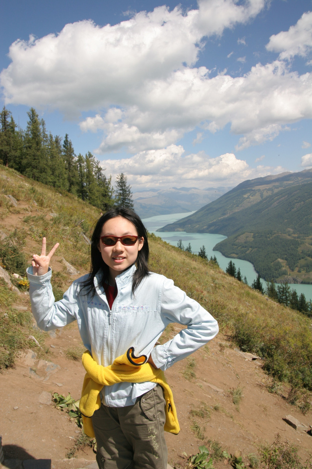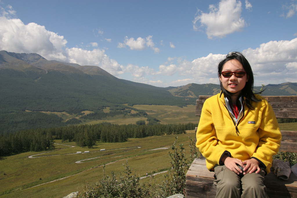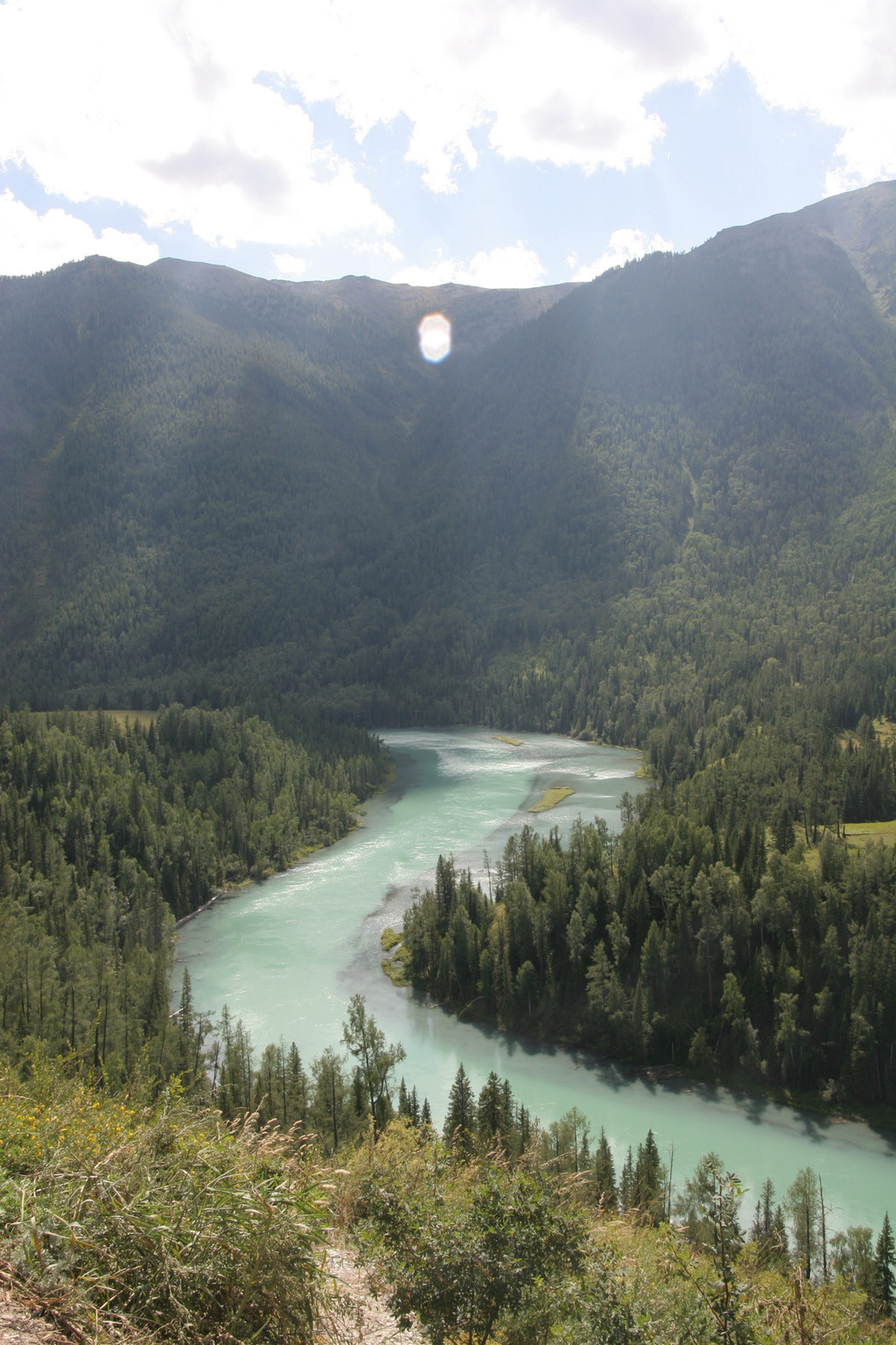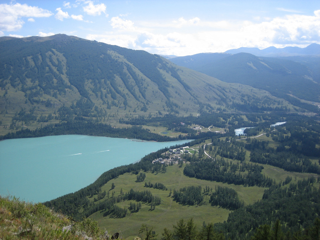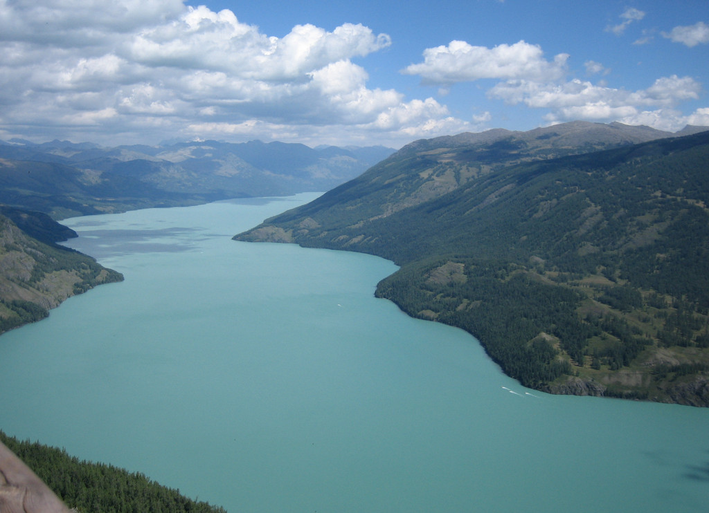 经过半个多小时的攀登终于登上了“观鱼亭”。俯瞰整个喀纳斯湖,确实美极了。蓝色的湖水,映村着巍峨的青山;高速快艇在湖面上划出一条条白色的浪迹,像乐谱上的五线;朵朵白云在湖面上留下斑斑倩影,飘浮不定,就象音符在跳跃,仿佛谱写美妙的乐章。而喀纳斯河就象草丛中的银蛇蜿蜒游向密林。