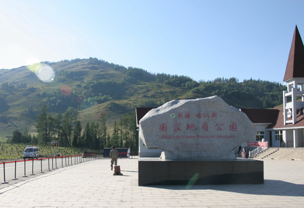 上午11时,我们到了喀纳斯自然景区,天气很好,阳光灿烂。门口的一块大石头上刻着——新疆喀纳斯国家地质公园。