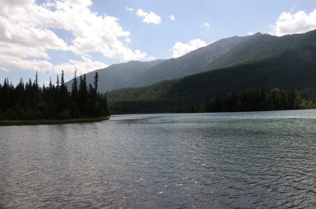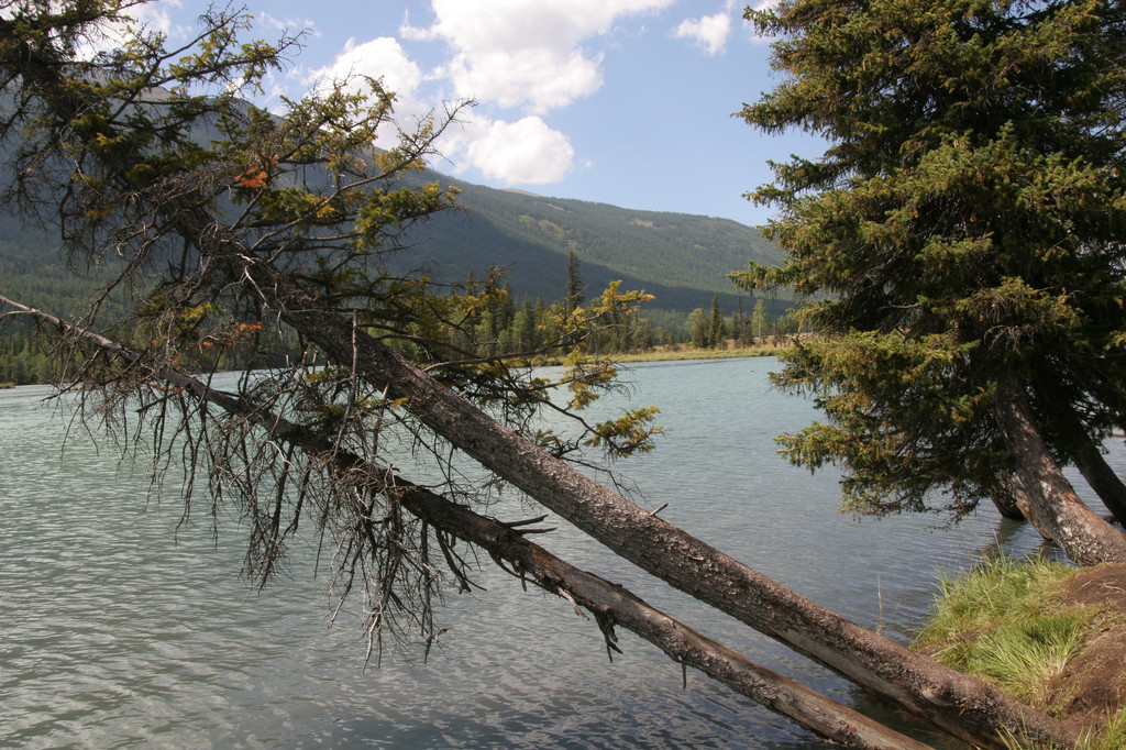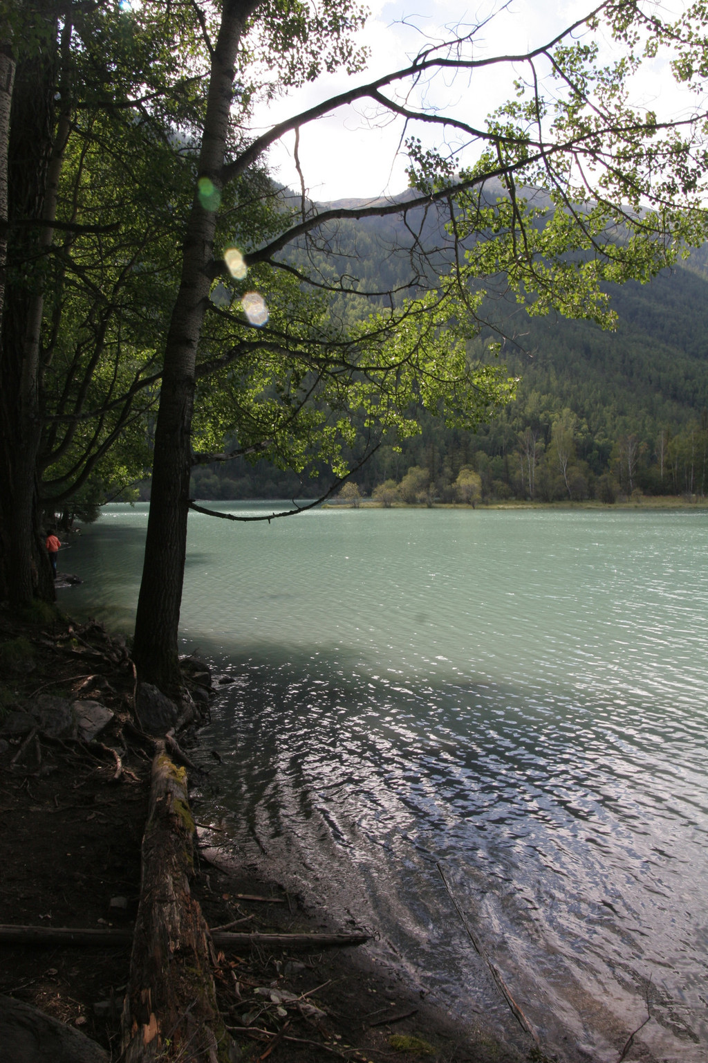 坐上摆渡车,游客不多,都有座位,可能是午餐时间。我发现司机是个俄罗斯人,发的都是卷舌音,下公路后有一大片开阔地,一条木栈道通向河边。喀纳斯河到此一下子变宽了,湍急的河水在这湾里突然缓慢了,河面平如镜。河岸上郁郁葱葱的松林映着河水泛绿,蓝天映着河水泛兰,河水颜色很丰富。