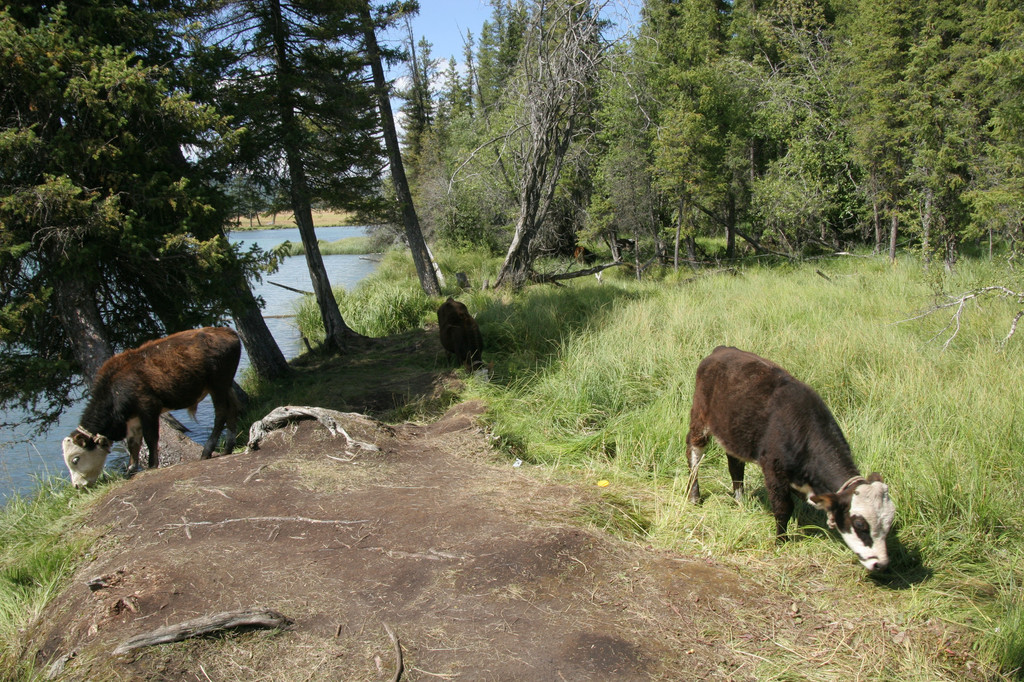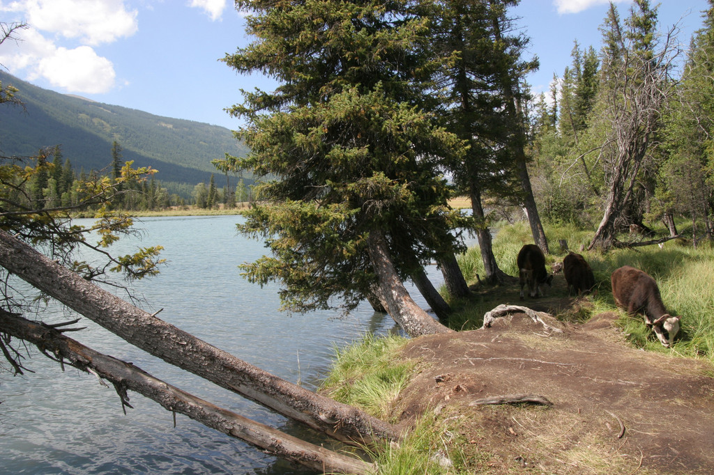 在河边有当地人牵着骆驼、出租民族服装的供游客拍照留念,也有牵着羊的小孩想赚点小钱的。游客们都在河边拍照,我们也不例外“咔嚓”了几张。开阔地的边缘是一片树林,我想走进去,但被一小片沼泽地挡住,走两步,感觉不行,鞋已沾满泥,再走过去整个脚都要陷下去了。于是我退出,在附近寻找有没有可以进去的地方。发现有一处有两片毛竹横在沼泽上面,约2-3米长,用脚试了试,感觉比较稳当,当时想都没想有任何危险,就像走平衡木一样走了进去。到里面一看,视觉效果与外面不一样,有种原始森林的感觉。河边的树由于各种原因斜着生长,但又不倒。岸上枯枝枯叶覆盖着一条小道,三头小牛正在寻觅着青草。这么美的景色能放过吗?于是我的CF卡内又少了近百M空间。回去叫他们也进来看看,但是她们都不敢从毛竹片上走,只能看照片了。