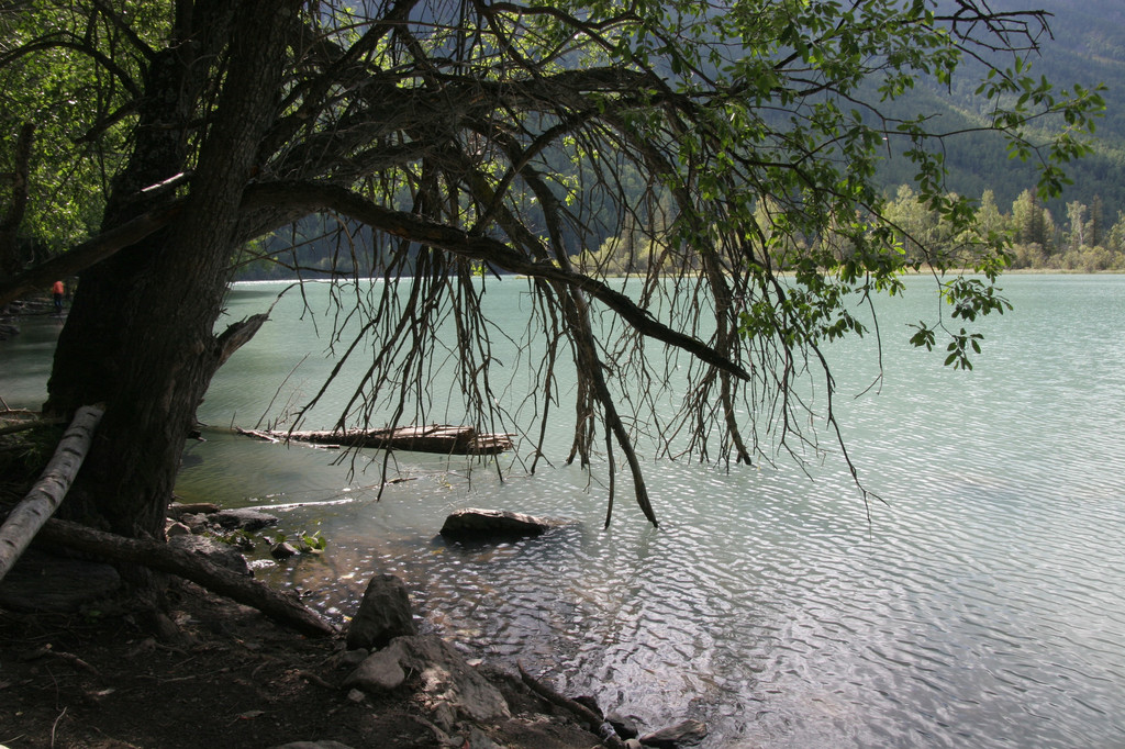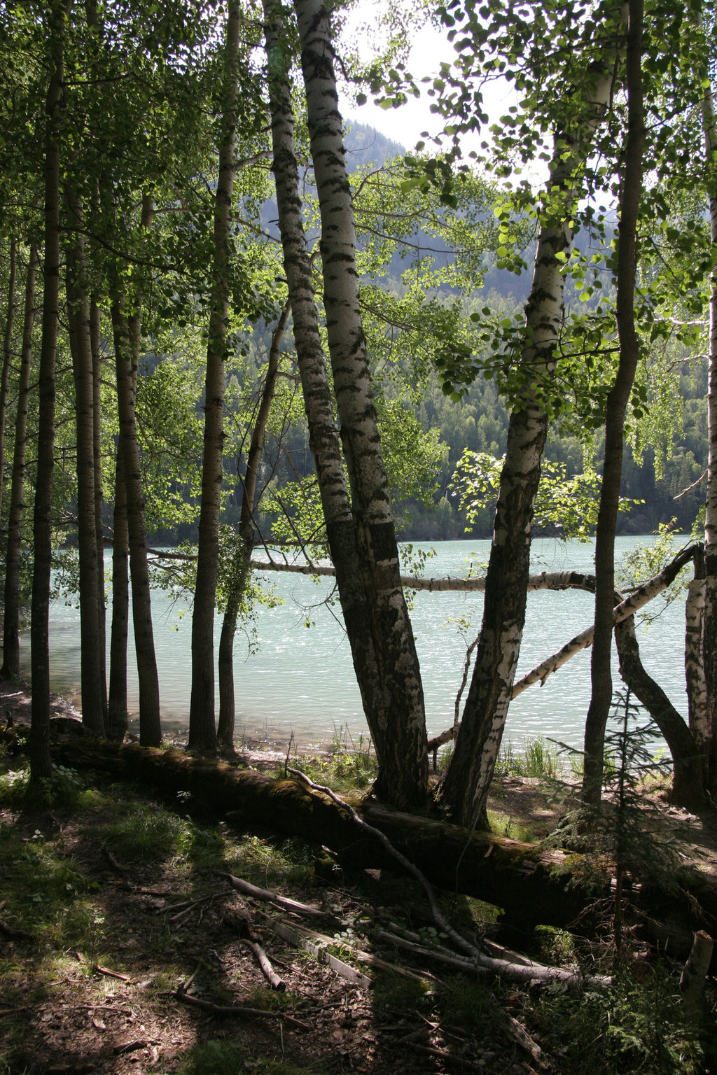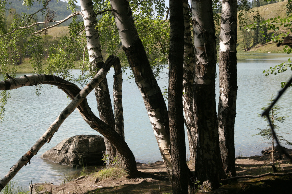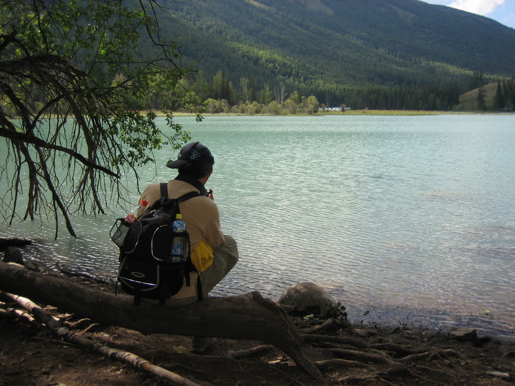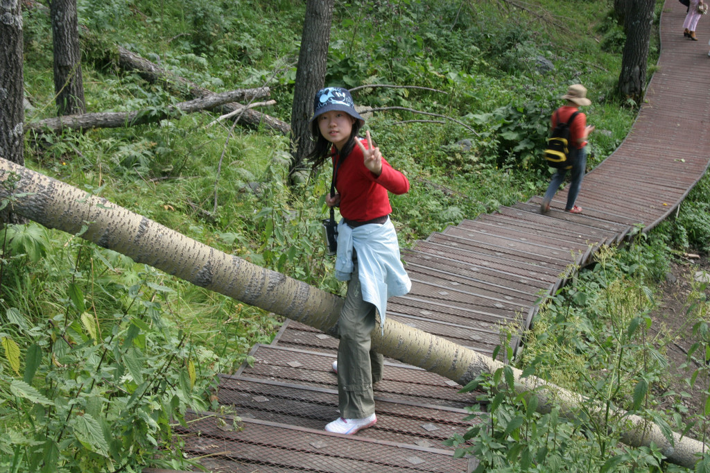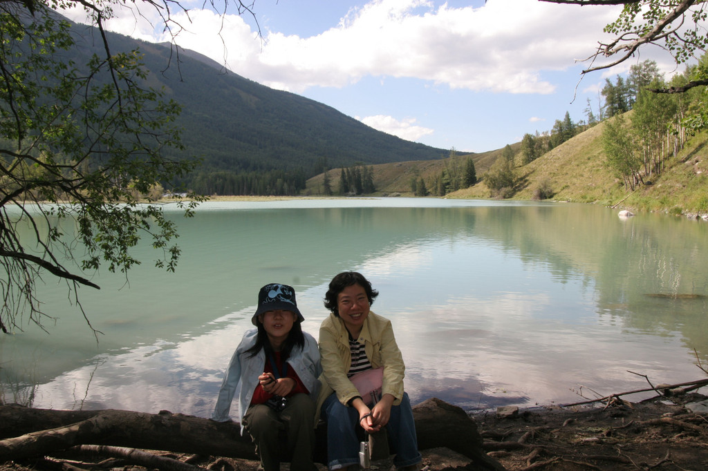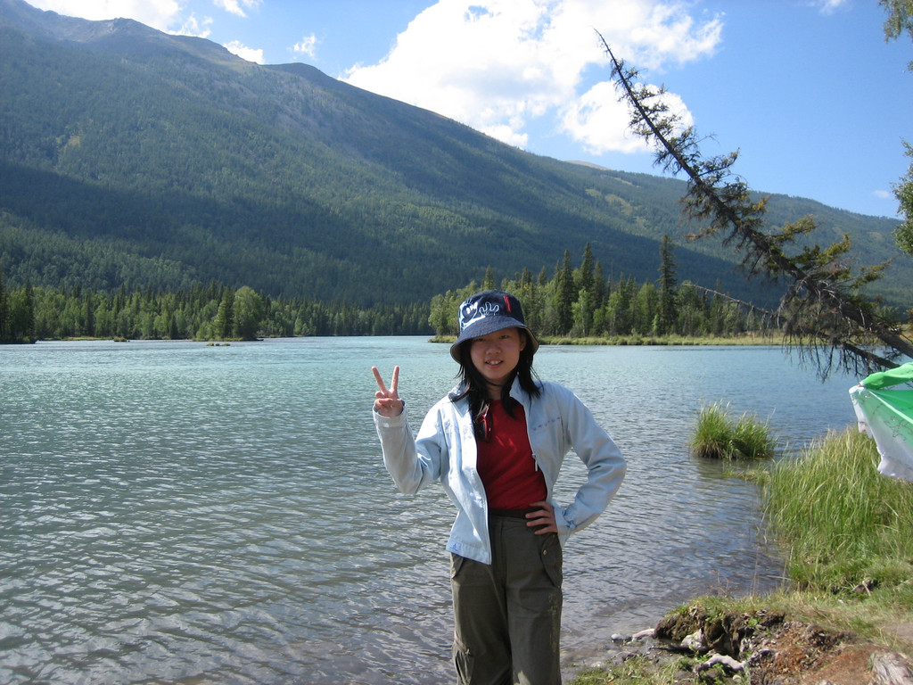 我们以卧龙湾景色为背景拍了些照,估计时间还比较充裕,就沿着台阶往河边走,与喀纳斯河零接触。这些台阶都罩着铁丝网,可能是为了雨天防滑。当下到河边时,倍觉凉爽。河水凉凉的,用毛巾蘸湿洗把脸感觉很舒服。高大的白桦树林遮挡了热烈的阳光,阵阵凉风从河面袭来,坐在河边的枯木杆上小憩无不感到惬意。