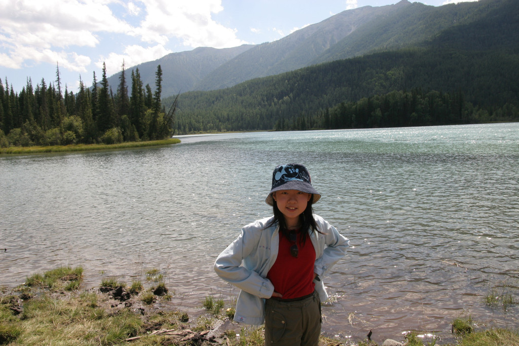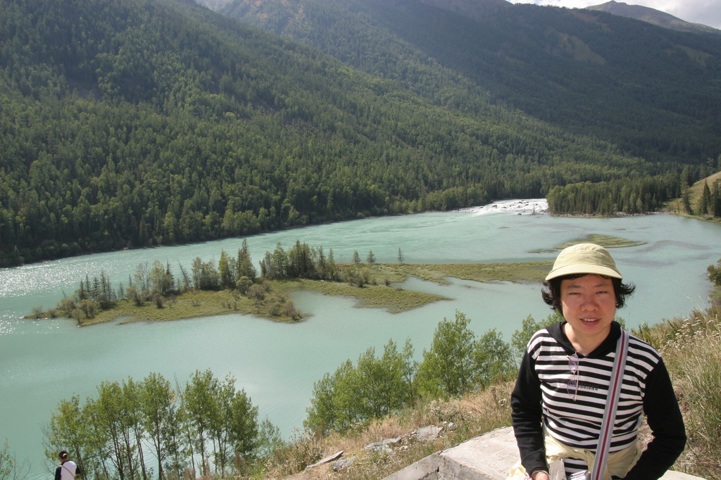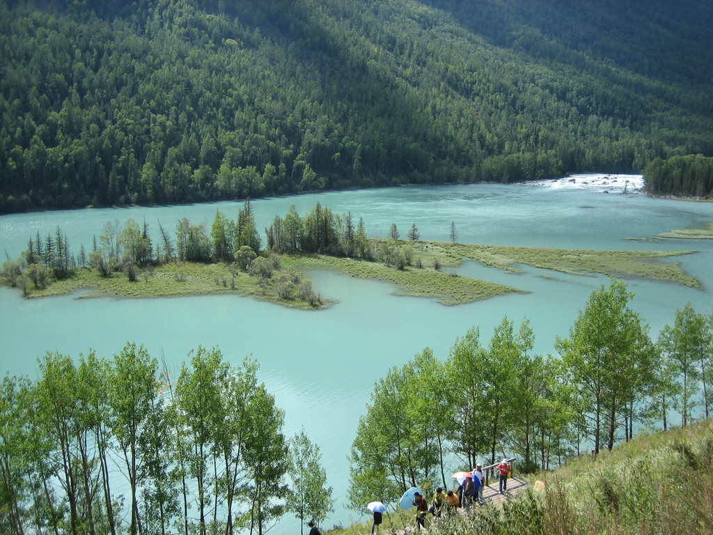 我们顺着石阶而下,目标河边,走了一半感觉时间不够,下去很轻松,但返上来很累又费时,于是决定到下个景点有时间再到河边玩(其实河边有路能走到下个景点的,我们当时不知道)。我们回到公路边等候去卧龙湾的摆渡车。没多时汽车把我们带到了卧龙湾景区。卧龙湾海拔1325米,因河湾中有一酷似龙形的河心滩而得名。喀纳斯河在此段切割于古冰川U形谷底部的冰川堆积物中,本来是普通的一段河湾,但若千年前,卧龙湾下方的左岸支沟爆发了泥石流,右岸发生了多处崩塌,泥石流和崩塌的堆积物使局部河道被束窄,并使其上方的河面变宽,水流变缓,泥砂在河中及岸边堆积形成河洲,造就了绮丽的卧龙湾景色。