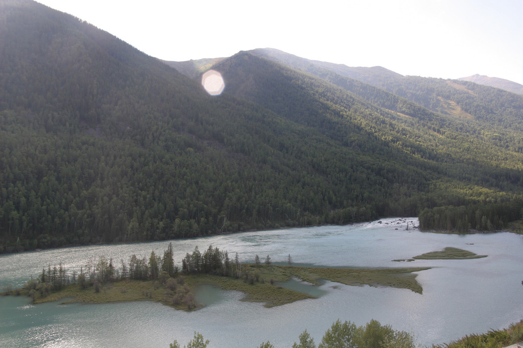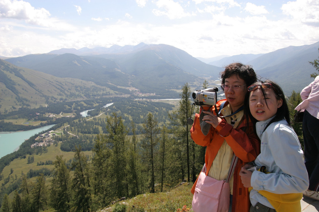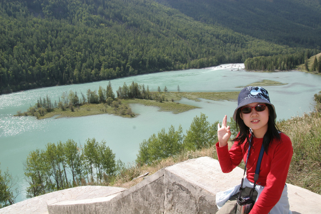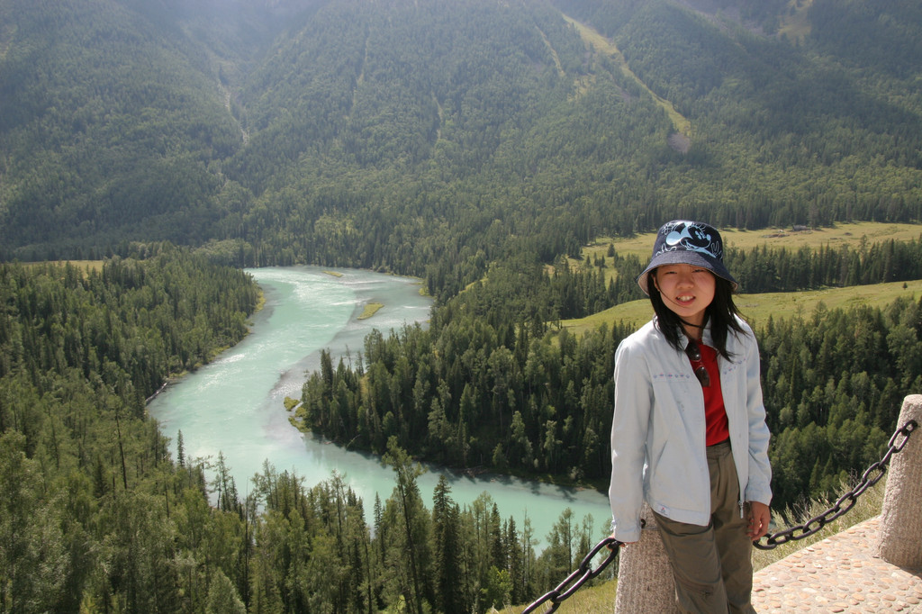 离开了神仙湾,坐上摆渡车没几分钟便到了月亮湾。公路旁汽车站台兼观光平台聚集了一些游客在拗造型。我们向下看,果然漂亮,喀纳斯河在此有两个连着的月牙型的湾,绿色的河水两岸松柏叠翠,灼热的阳光照射着河面泛起一层薄薄的雾气,给月亮湾增添了一份神秘感。月亮湾中有两个看上去像脚印的滩涂,导游说是观音菩萨经过时留下的脚印,这仅仅是一个美丽的传说。不用多说我的相机又开始工作了,拍完照片又拿着摄像机扫了一遍,女儿走了过来,对着摄像机镜头,学着主持人介绍着美丽的景色。