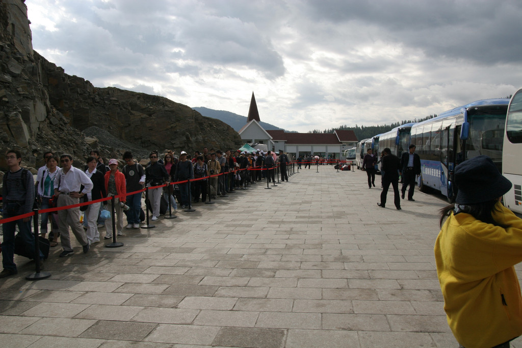 这时的门口人山人海,从各个地方来的游客都差不多这个时间到达,由于要换车,所以都下车往景区入口汇聚,次序有点乱。