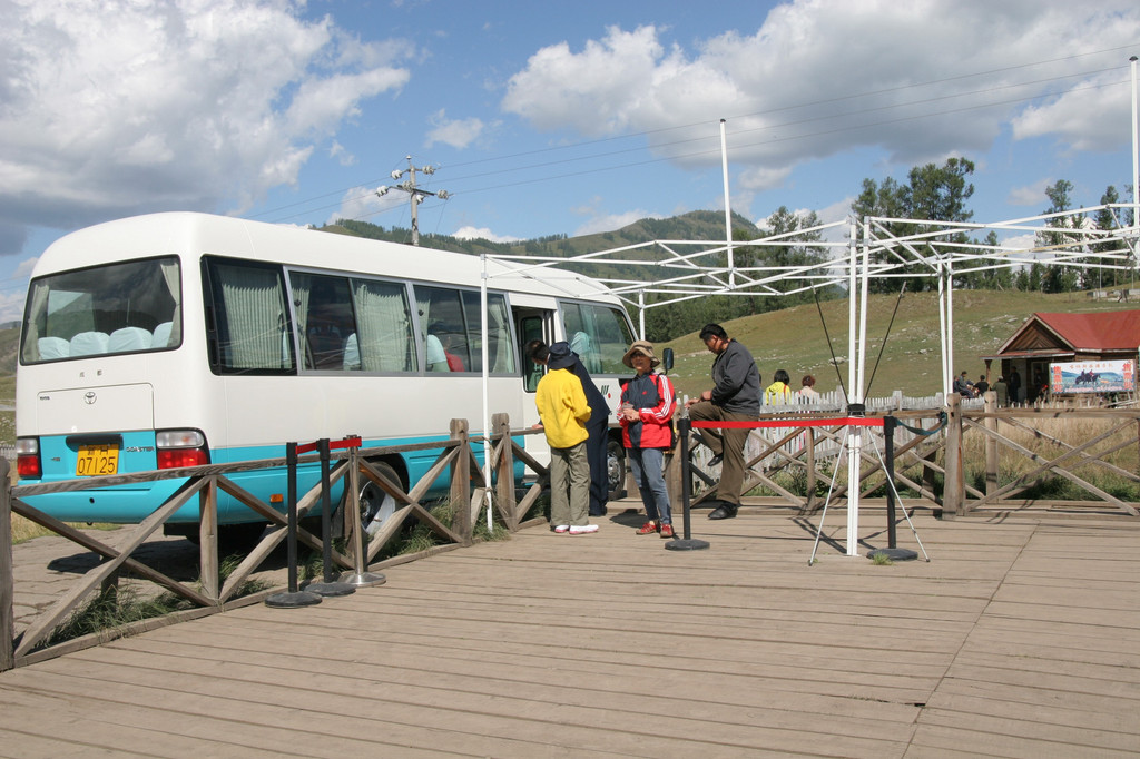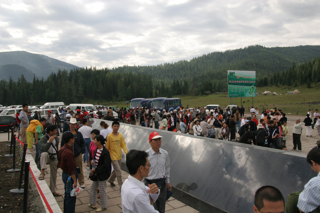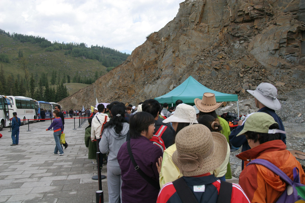 据介绍由于环保的原因,车不能开进景区,要换景区的所谓“欧Ⅲ”排放的景区摆渡车。景区内外都没有大型的宾旅馆,所以绝大部分游客都被安排在3-4小时车程的阿勒泰市和布尔津县城。少部分游客住离景区约30公里的贾登峪。