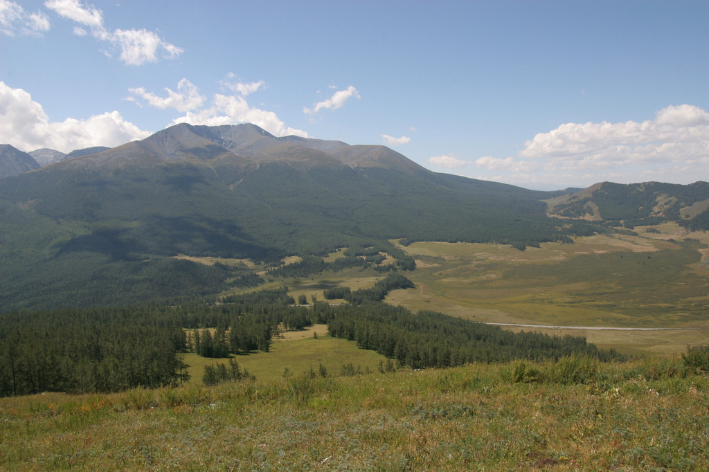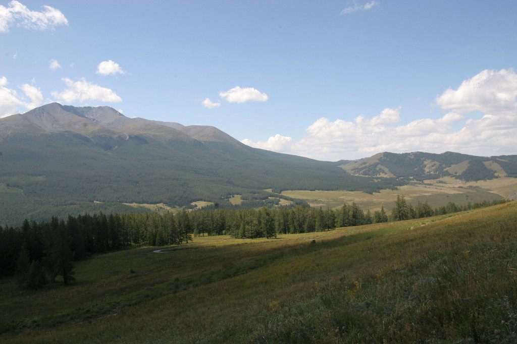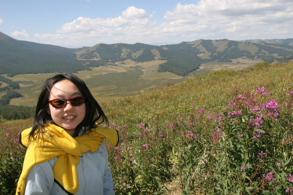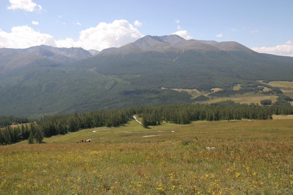 下山是走背湖的盘山道,比较轻松。但后山的景色不逊于喀纳斯湖,满山遍野的花草五彩缤纷,雄伟的阿尔泰山脉连绵起伏,山顶的皑皑白雪在太阳的照耀下格外显眼。