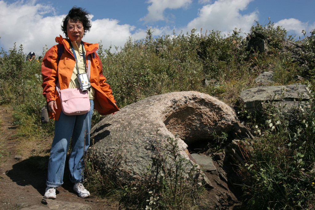 石级的边上有一块圆圆的、中间凹的石头引起了我的注意,石头前面的石碑上面粘着一张照片介绍说该石头在成分上和外观形态上都和这座山本身的岩石格格不入。因为它是由古冰川带到这里来的不速之客,地质学上称之为冰川漂砾。这些大石都是来自喀纳斯河上游的花岗岩,在被冰川搬运的过程中,被磨蚀得圆润平滑,也只有冰川的携带,才能把这样的大石长距离的运送到此。能在喀拉开特的高山上发现这样的漂砾,说明至少在十多万年以前,这里也曾是冰川蜿蜒的谷底,后来因为地壳上升,才把冰川堆积物抬高到现在的位置,它的堆积时期比喀纳斯湖前端的冰、丘陵更早。