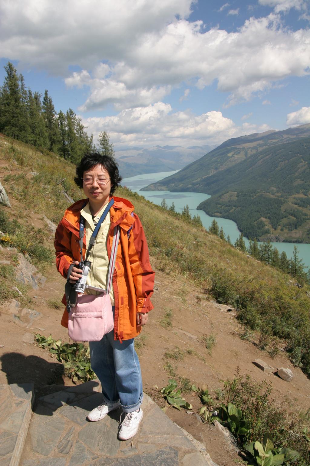 约20多分钟到半山腰,我们下车开始沿湖侧拾级而上。喀纳斯湖是坐落在阿尔泰深山密林中的高山湖泊。湖面海拔1374米,面积44.78平方公里,湖水最深处达188米左右。
