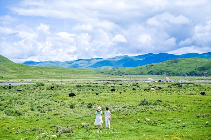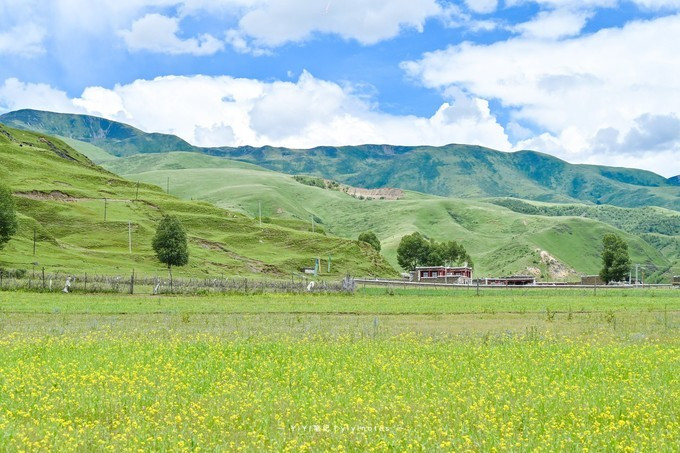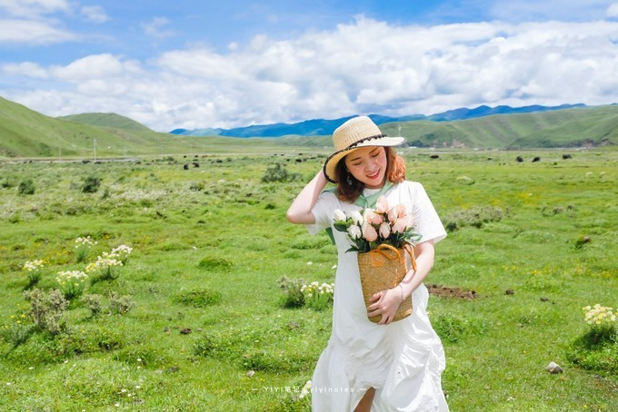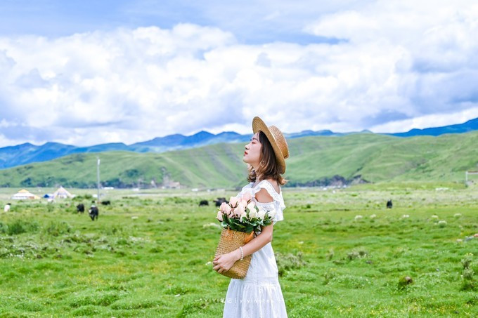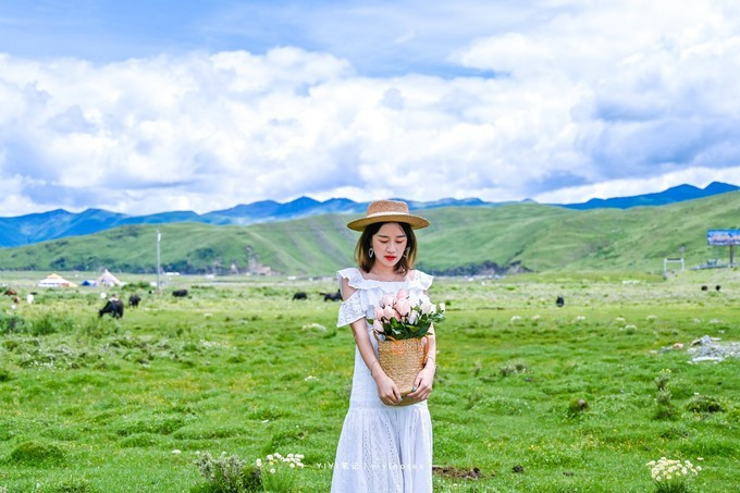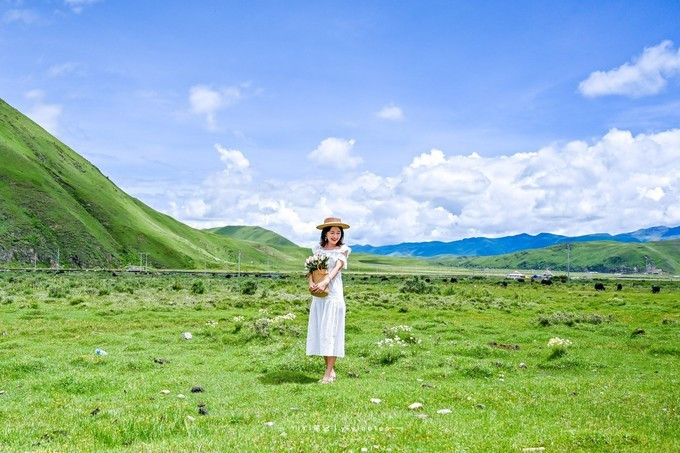 眼前是开着鲜花的塔公草原,背后就是朵朵白云,阳光投下的光影非常好看。