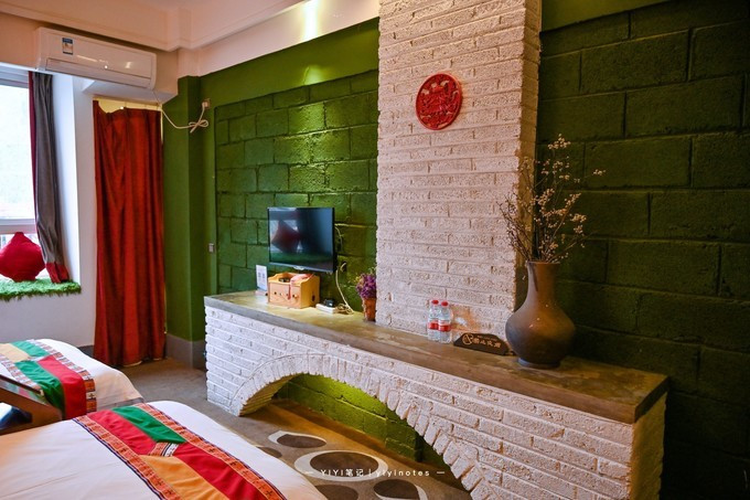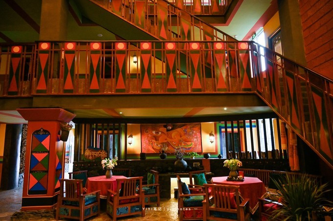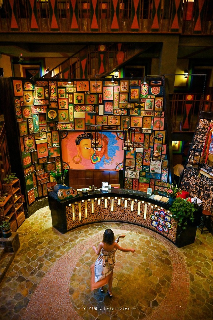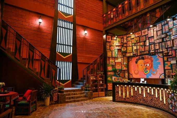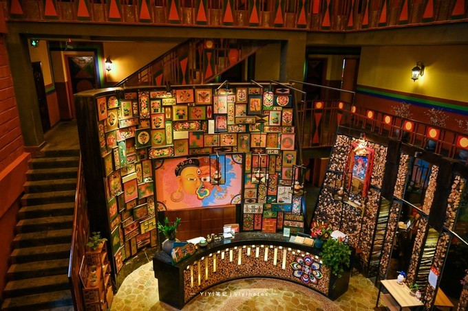 酒店的整体的装修风格非常有民族特色,从大门到走廊,在从大厅到房间内都挂有全手工的壁画。
