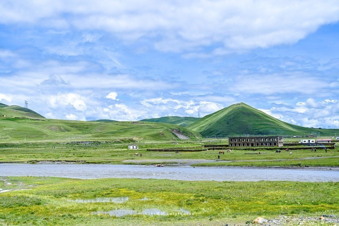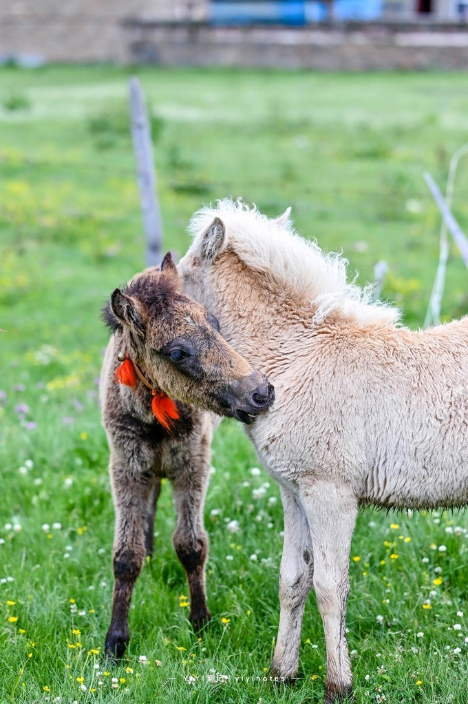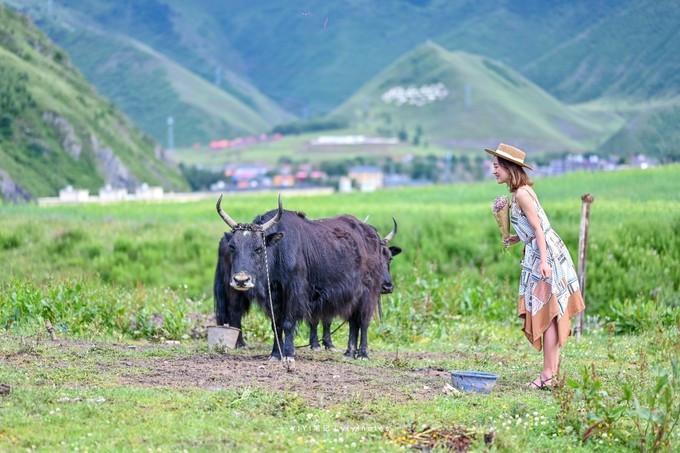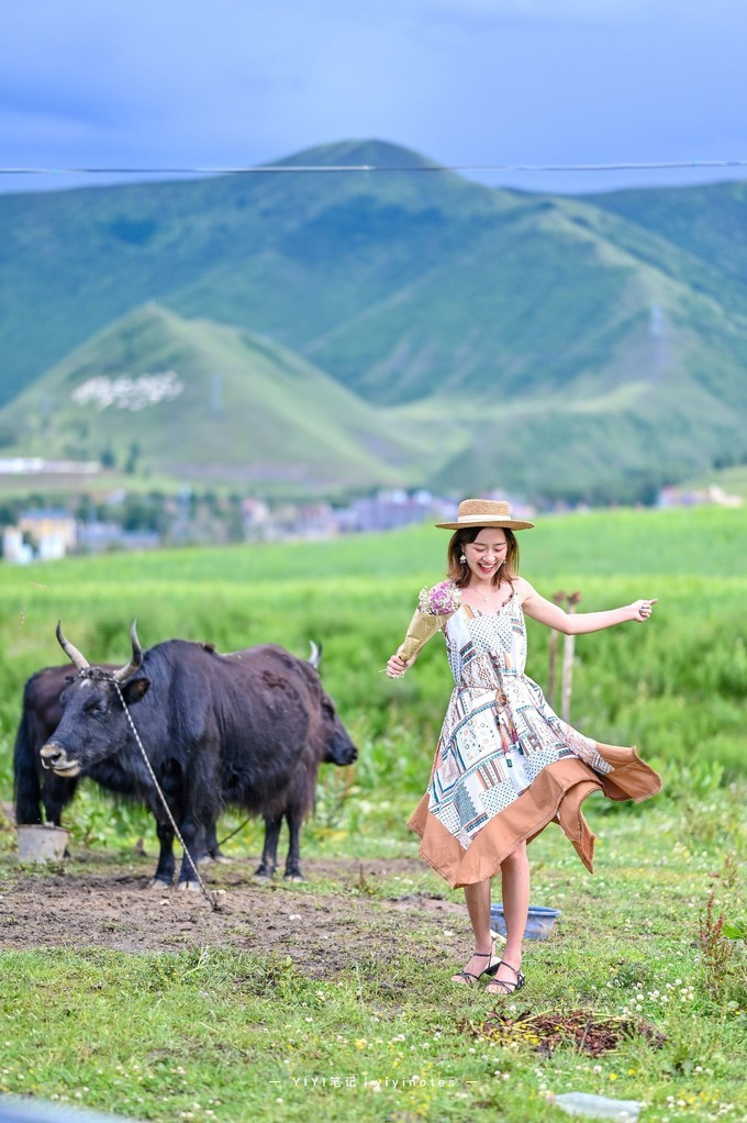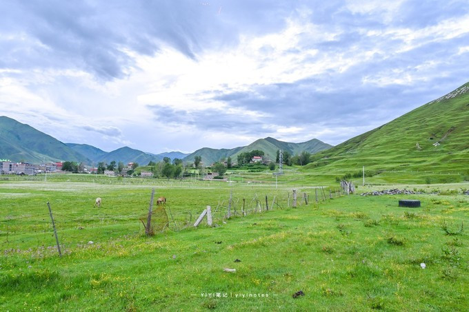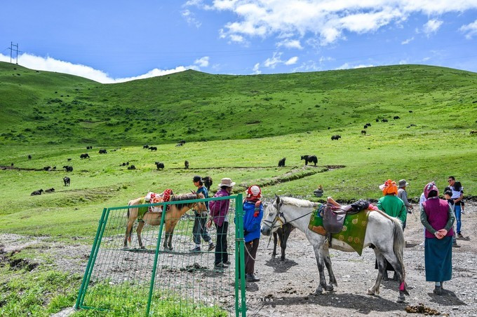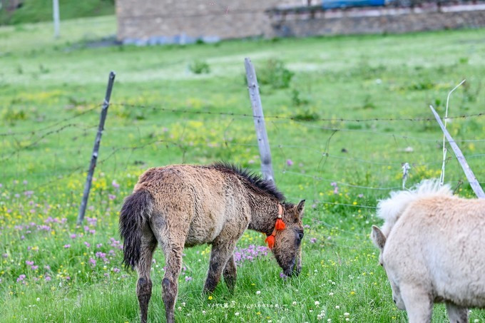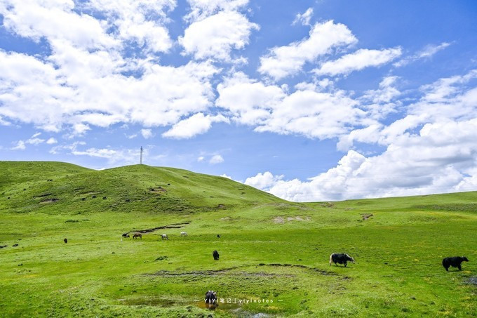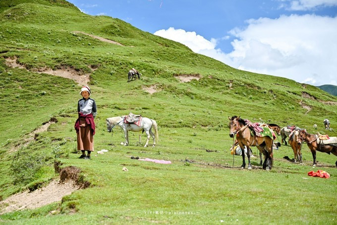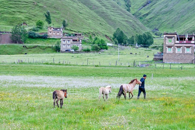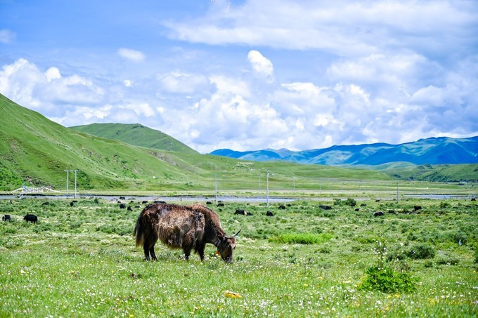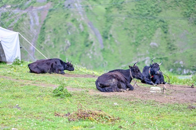 不远处绿茵茵的草地上还有几只牦牛、马儿们在一起悠闲的吃草。