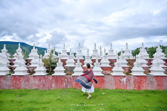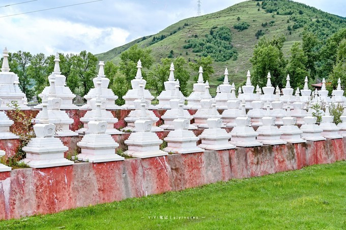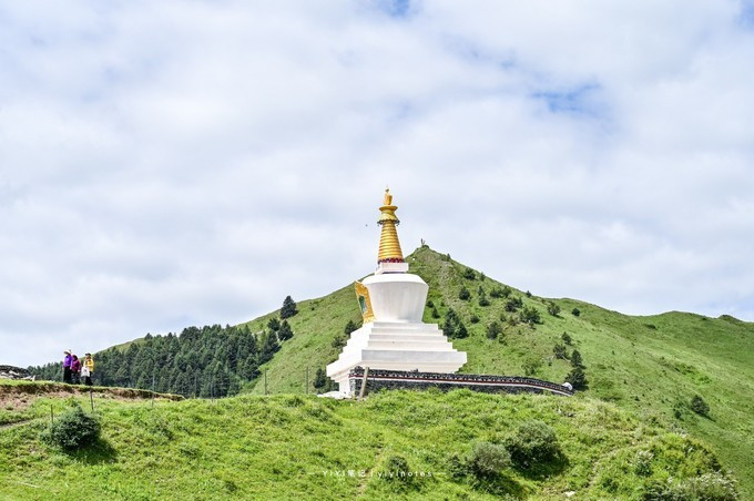 我们的车子一路向塔公草原方向开,当山变得平缓,能看到长长的转经筒和山顶的白塔时,就已经在塔公寺附近了。