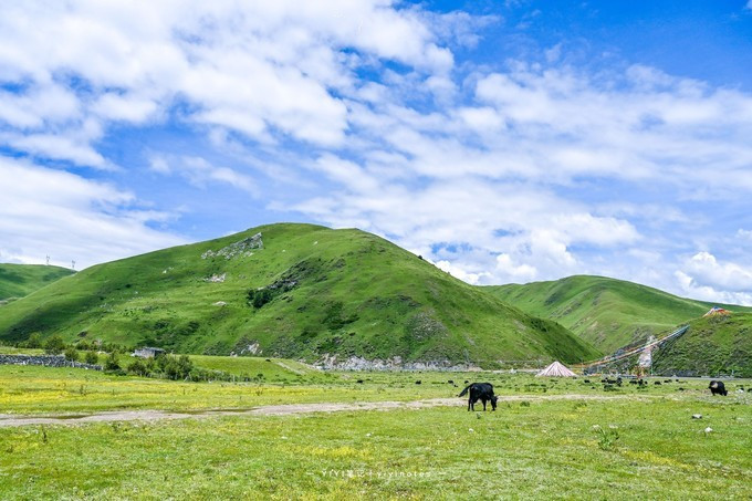 在 新都桥 可以看到成群的牦牛,牧场上还分布着几顶帐篷,等到饭点的时候,牧民们就开始准备美食,帐篷里就会开始散发出扑鼻的奶香。