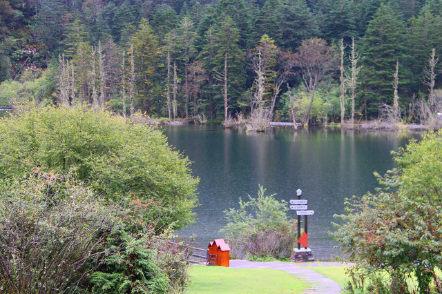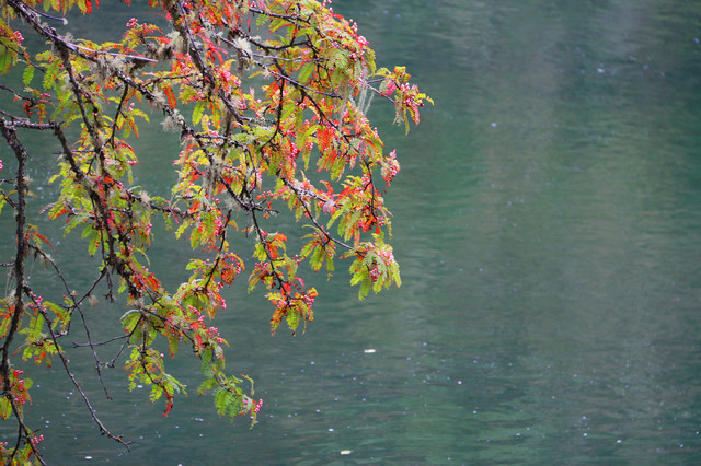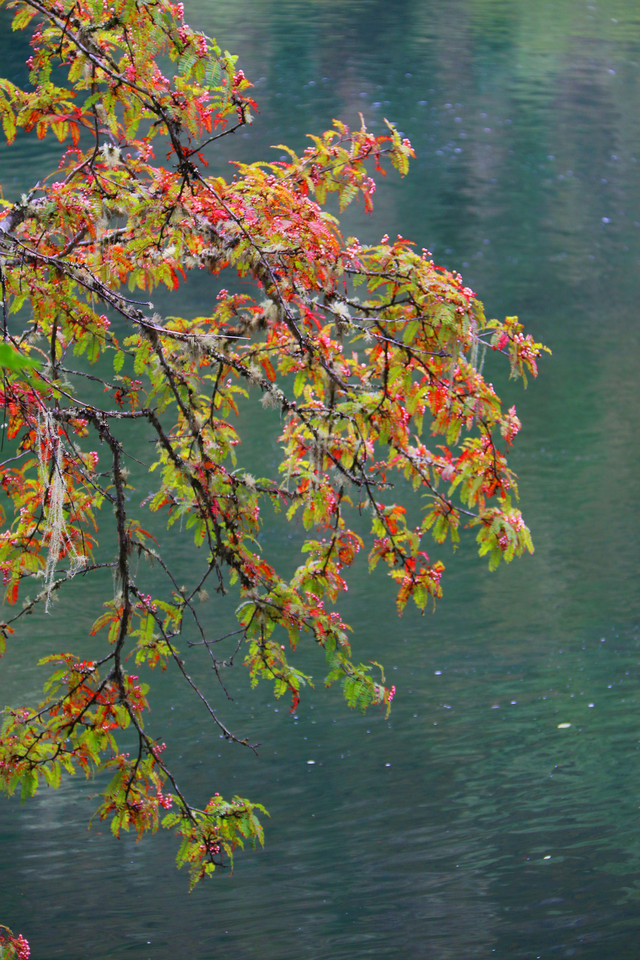 彩林渐染,树叶初红,倒映在碧绿见底的湖水中,林鸟喁喁,山风轻拂,湖光山色浑然天成。