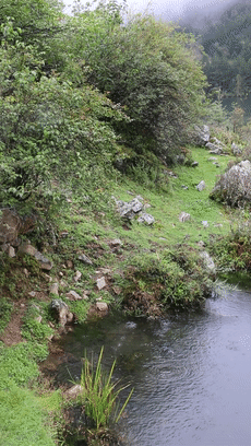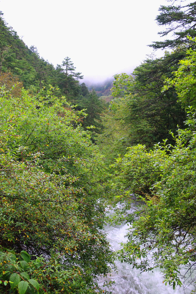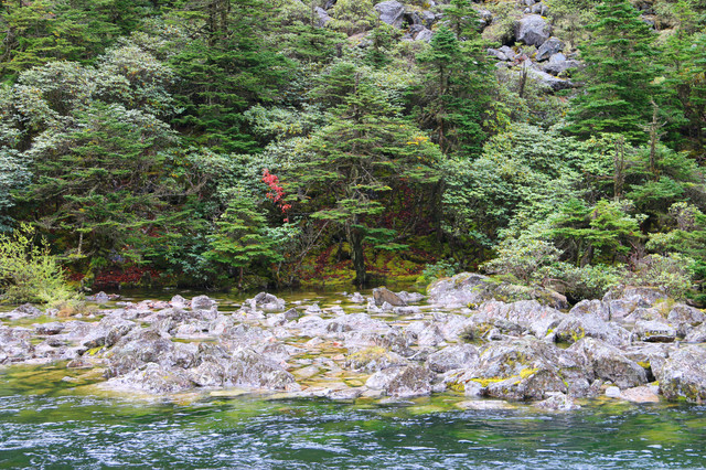 水底藻类清晰可见,溪边怪石嶙峋,两岸森林各有千秋,或直耸入云,或低矮丛生,不少树叶已开始变色,正在为今年份的彩林风光努力筹备着。