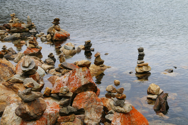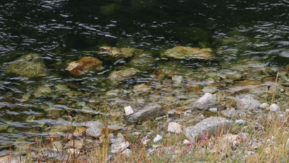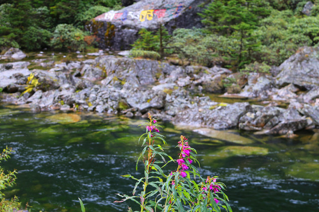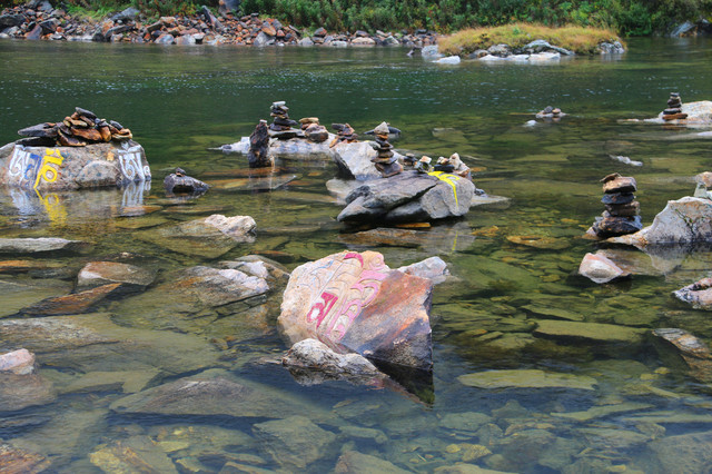 清可见底的水质,视力好的小伙伴还能看到水底游鱼,靠近栈道的一侧散落有玛尼堆和刻着六字箴言的石头,寄托了当地藏民的信仰与执着,寓意着美好的期许。