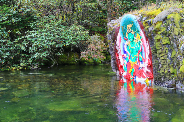 耍完木格措和红海草原后,我们是直接走的栈道往下,到达的第一站就是静心池和瑶池,石头上刻的四尊佛像各有寓意,导游小姐姐都会一一讲解到的~