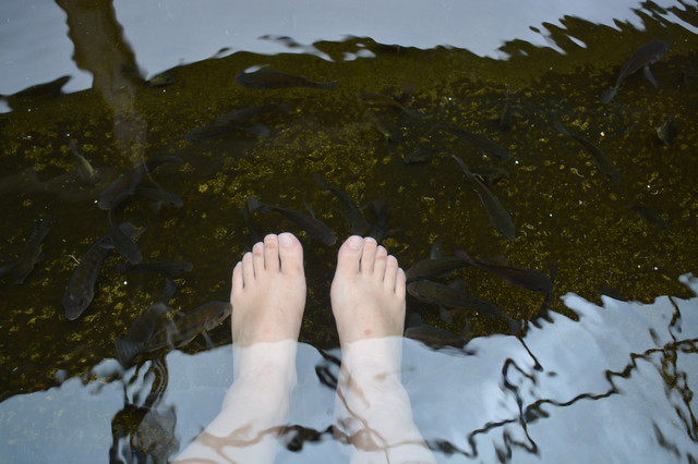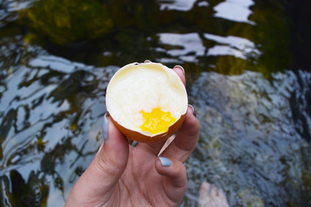 等jio上的死皮泡出来后,再到旁边的鱼疗池里做个脚部SPA,吃一个景区特有的豆花鸡蛋(浸泡在高达95℃的温泉水自然熟的溏心蛋),甜甜咸咸的很软,吸溜一口就进去了,个人觉得很好吃!