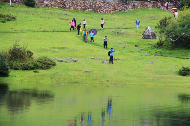 如九寨一般变幻的水,微波荡漾,碧绿无际的大草坪,傍晚是牛羊最爱的啃草处,白日里是游客喜爱的打卡地。
