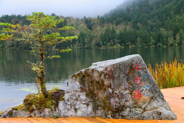 森林绕七色海而生,碧绿的湖水域清幽的林木,只待金秋来时,泼金飞红,漫山彩林,微风过处湖面如调色板倾泻。