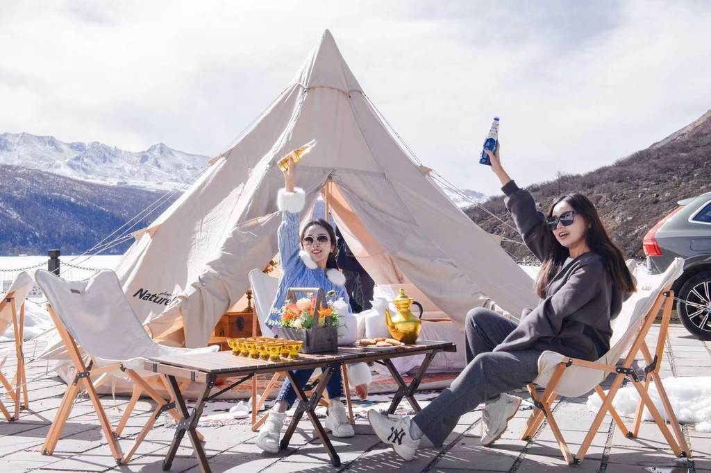 第一次在雪山下喝下午茶,就布置在木格措景区的草原与湖泊边,摆上好看的具有名族气息的茶碗,搭上简约的白色帐篷,还得配洗一个好看的花束,一边看风景,一边仔细尝一尝这绝配的青稞饼干和奶茶,完全是区别于城市咖啡的乐趣,摇摇晃悠好不惬意。