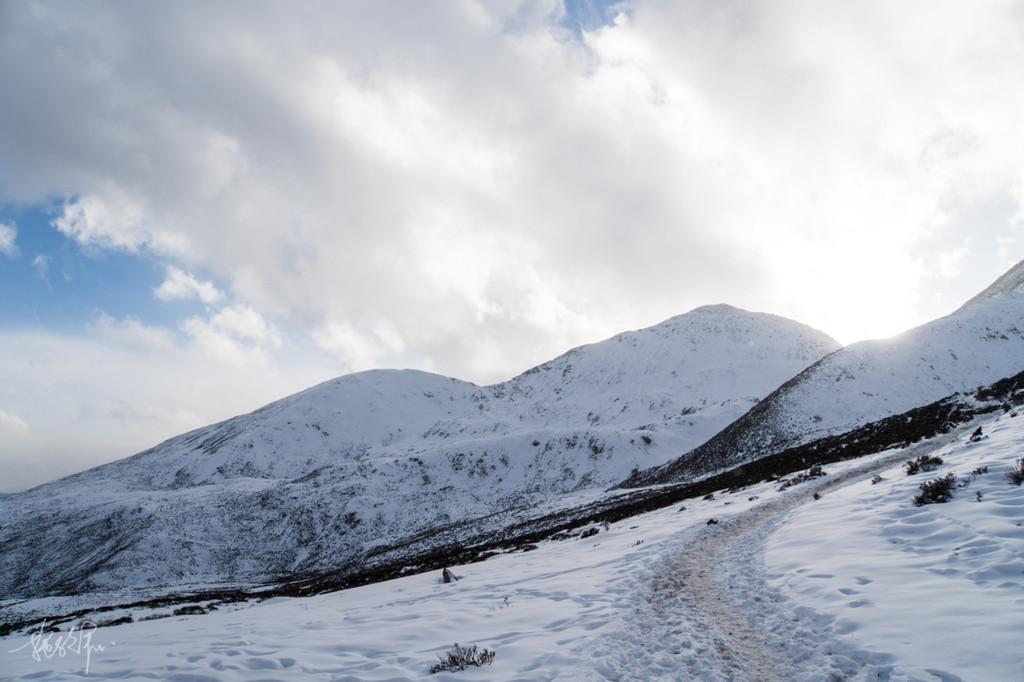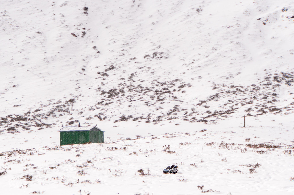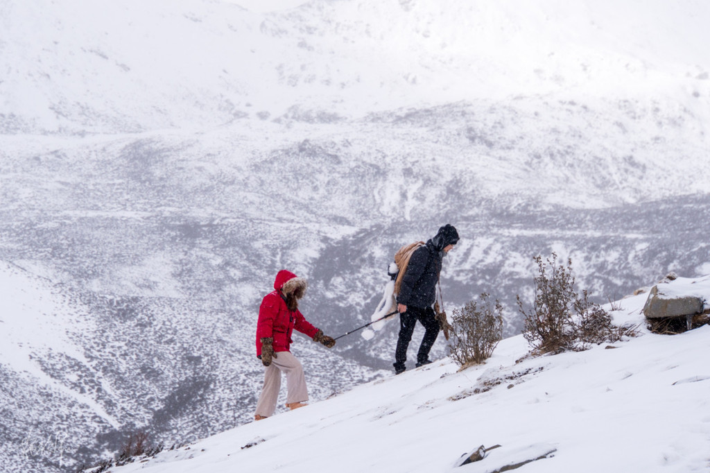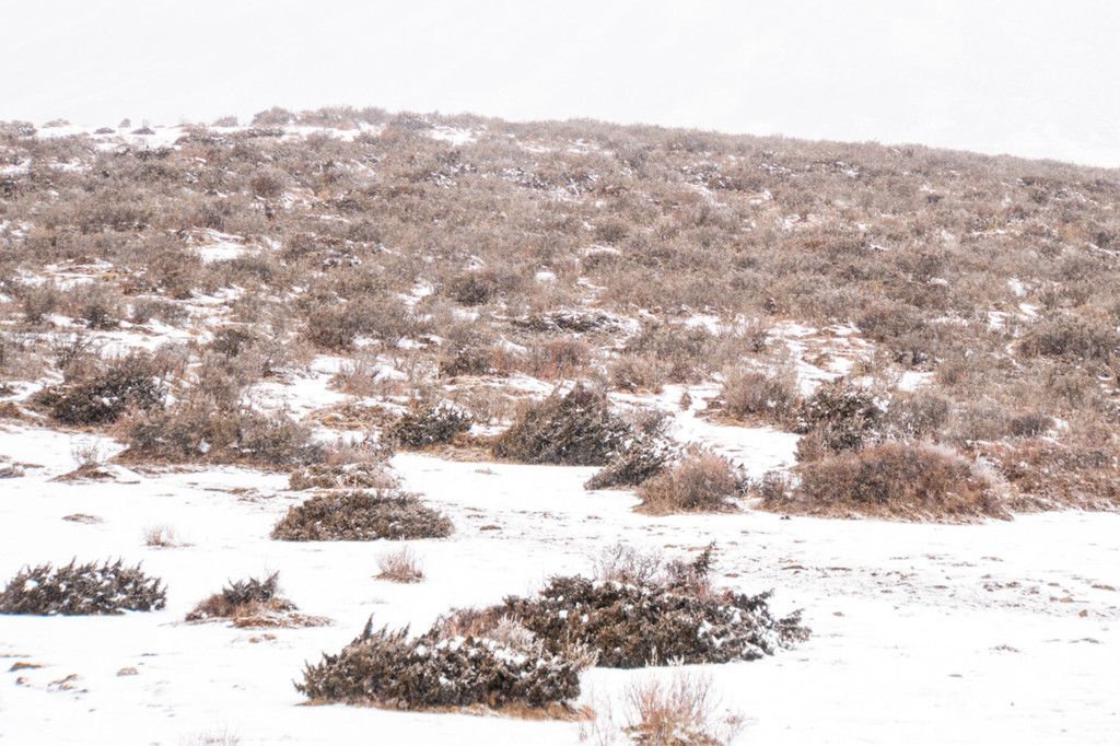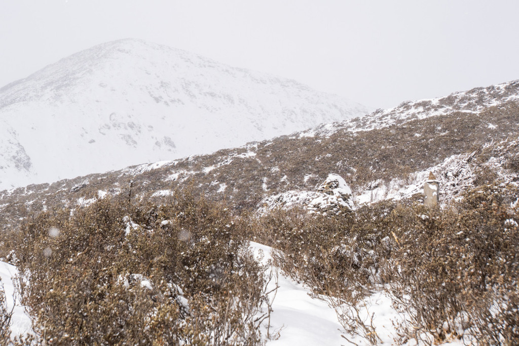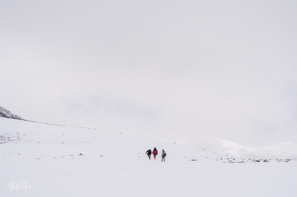 缓步向山里走去,整个路程我们走了大概两个半小时多一点,走到半山腰时天下起了大雪,让原本就不太好走的山路雪上加霜。有那么一些瞬间,我甚至都以为我要雪盲了,走在路上白茫茫一片又没有墨镜,眼睛只能直勾勾看着远处的灌木丛林,好歹有点黑色,能减少点雪盲的机率。