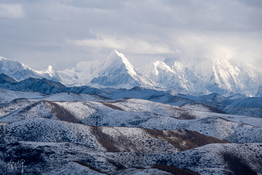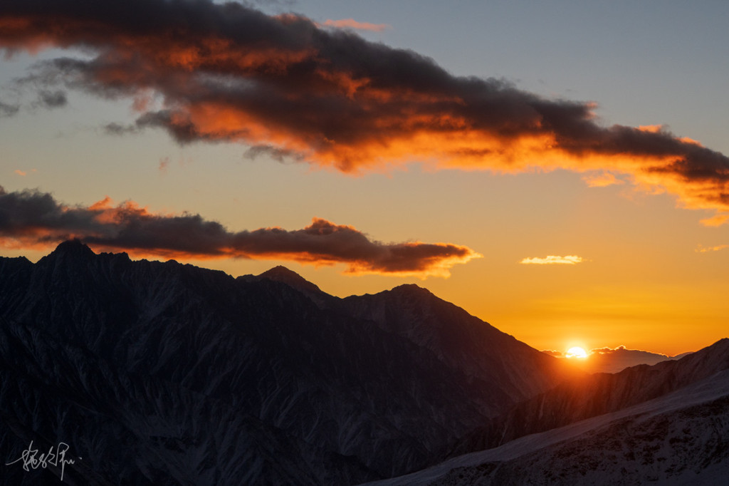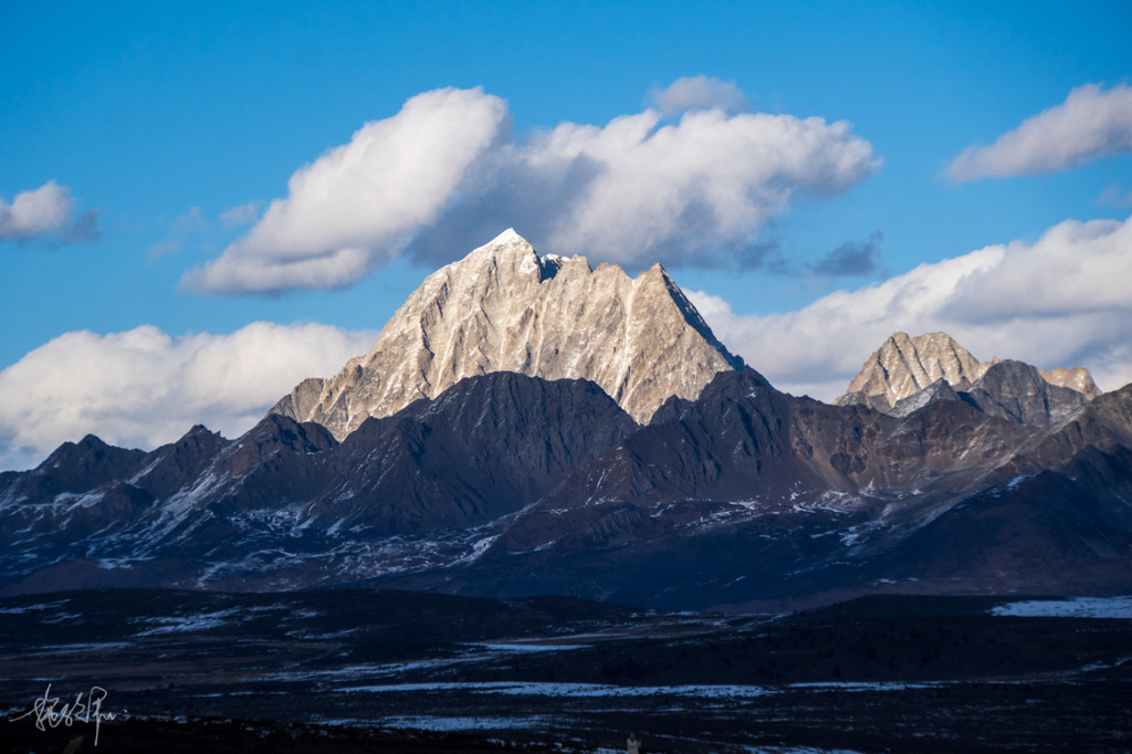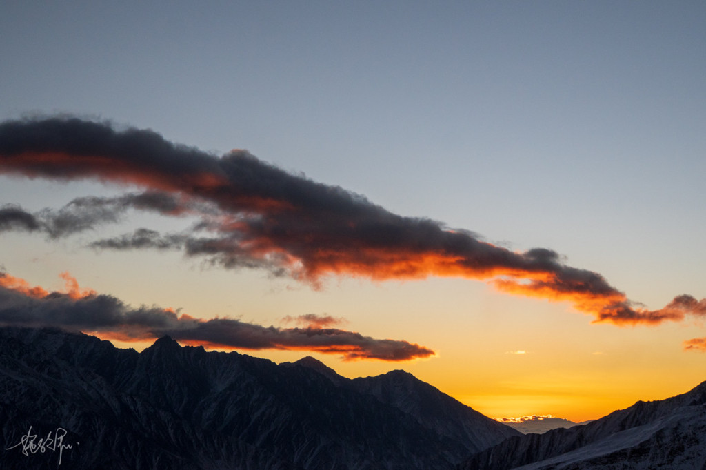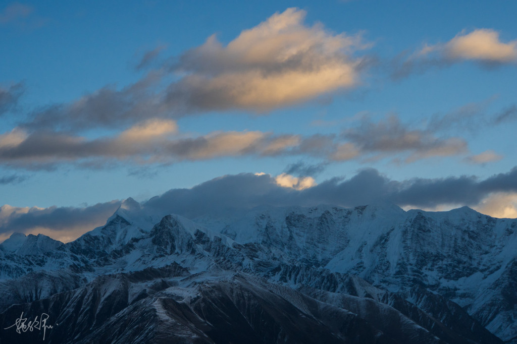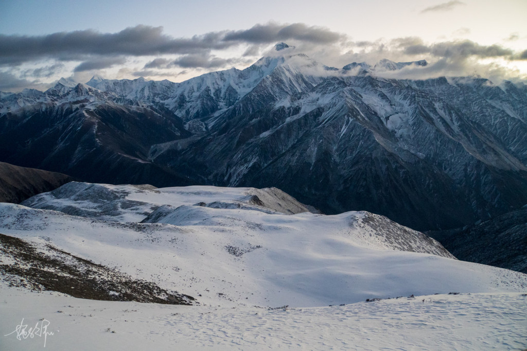 天已经开始有了一丝丝的蓝紫黄的光线,在 贡嘎 山主峰的右侧,是今日太阳蹦出的方向。 日照 金山肯定是没有了的,但也不妨碍我满心欢喜地期待一会儿的日出。