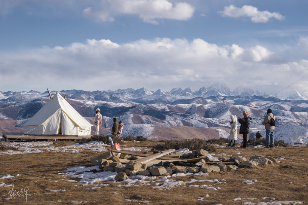 山顶有星空营地供人们选择住宿,也有售卖一些饮料烤肠,就着近处的白色帐篷和远处的雪山同框拍照,还是很特别的。冬天的高原,真的很美,但实在太冷了。让我在这山头露营,我还是会打退堂鼓,但如果是夏日来到这里应该会很舒服吧。