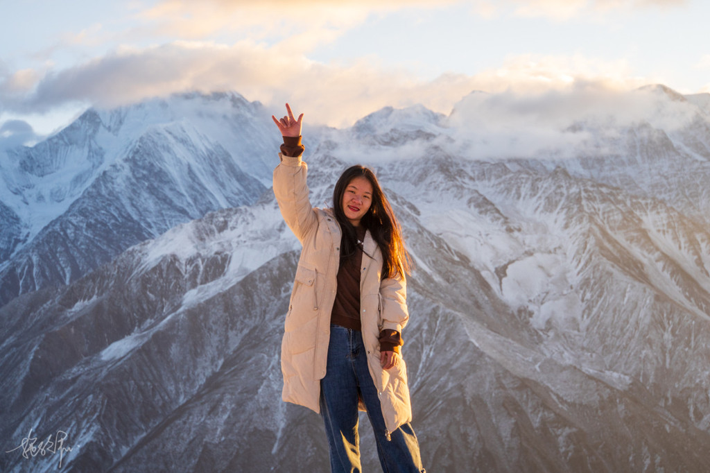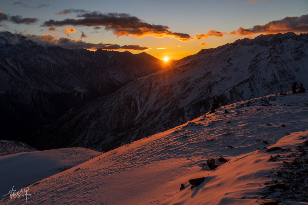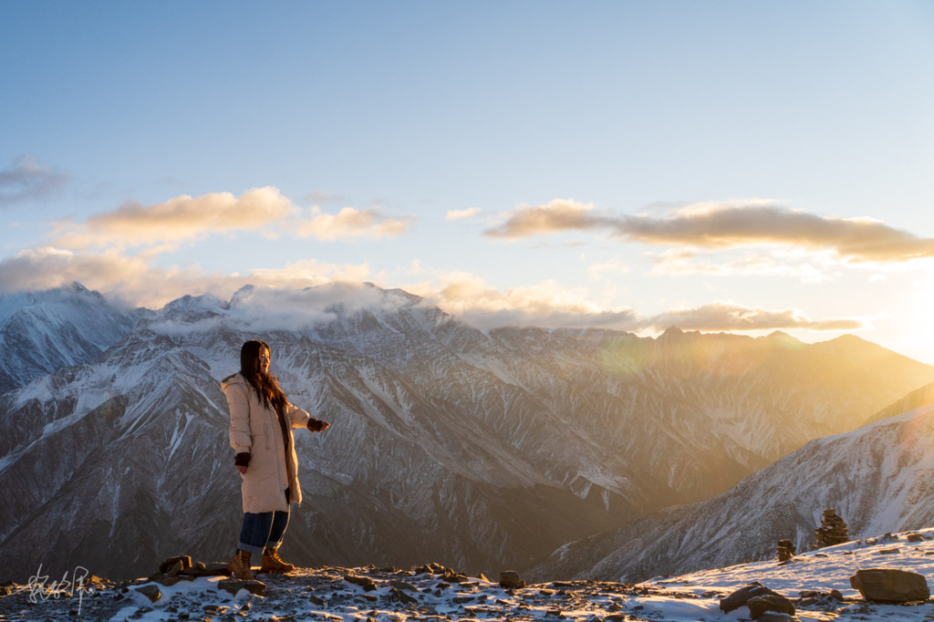 最美的当属子梅垭口,六点半的上木居天还是黑的,民宿老板 阿卡 抹黑带我们上子梅垭口看 贡嘎 山的日出。当第一缕阳光映红了我们这边的山体, 贡嘎 主峰也露出了全貌,那一刻,觉得再辛苦都值了。