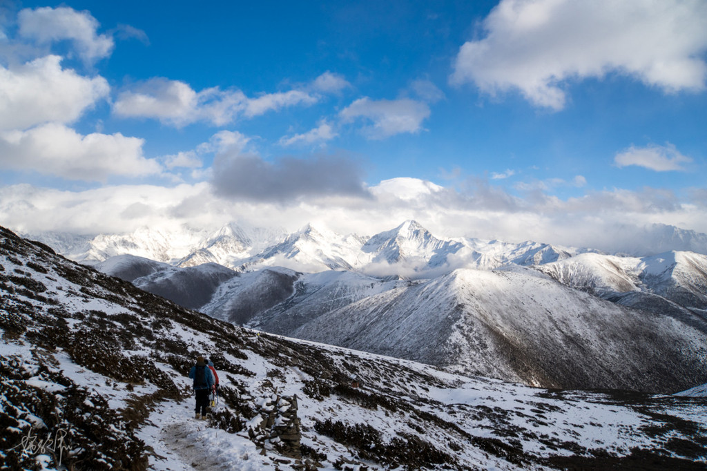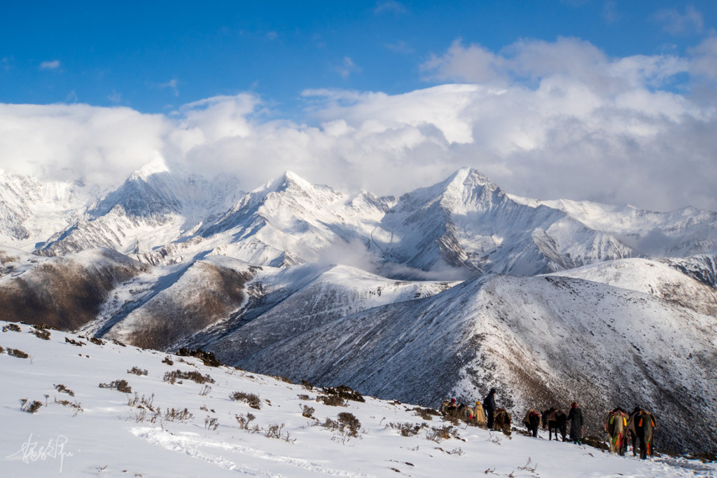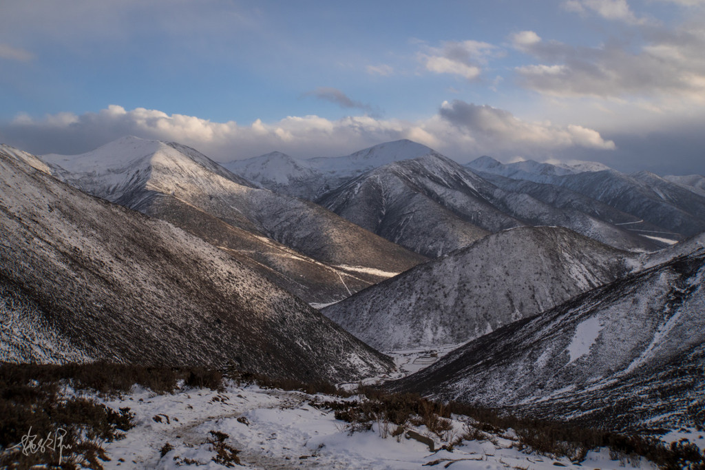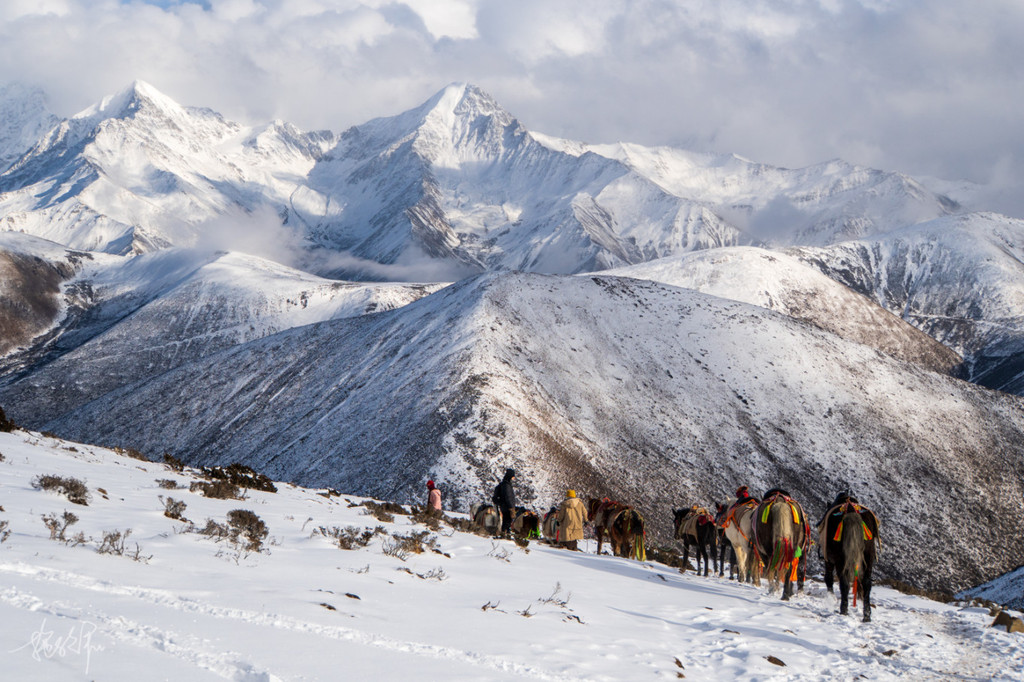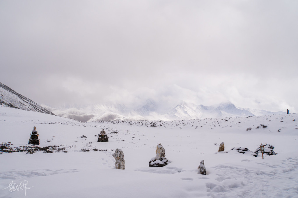 雪是越下越大,到了山顶,才发现从前的白帐篷现在已经变成了黑色联排房子。小马哥第一个到的山顶,我看着他横穿整个冷嘎措,因为完全冻住了,我们的眼前只剩下一片雪白,压根见不到冷嘎措的影子。