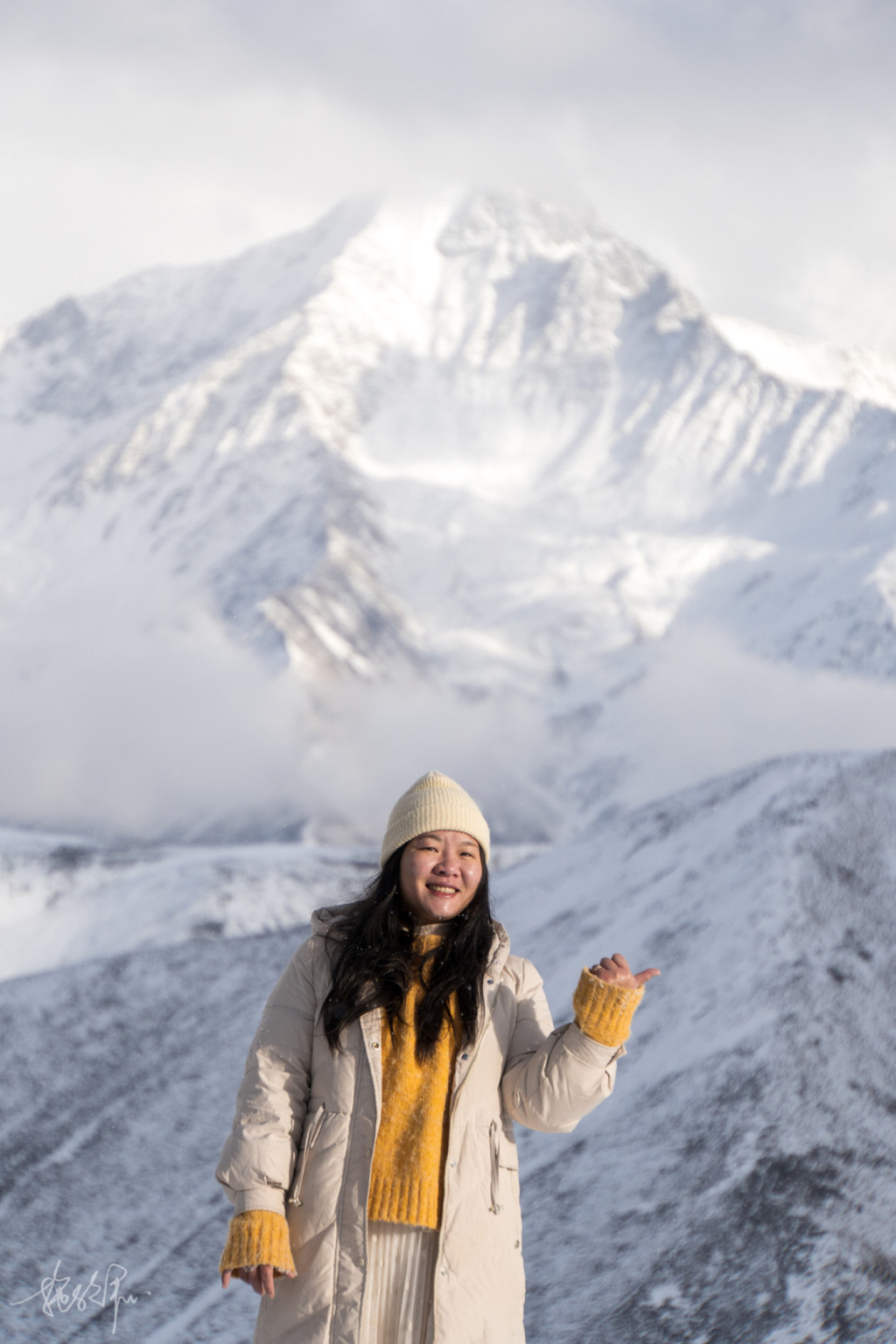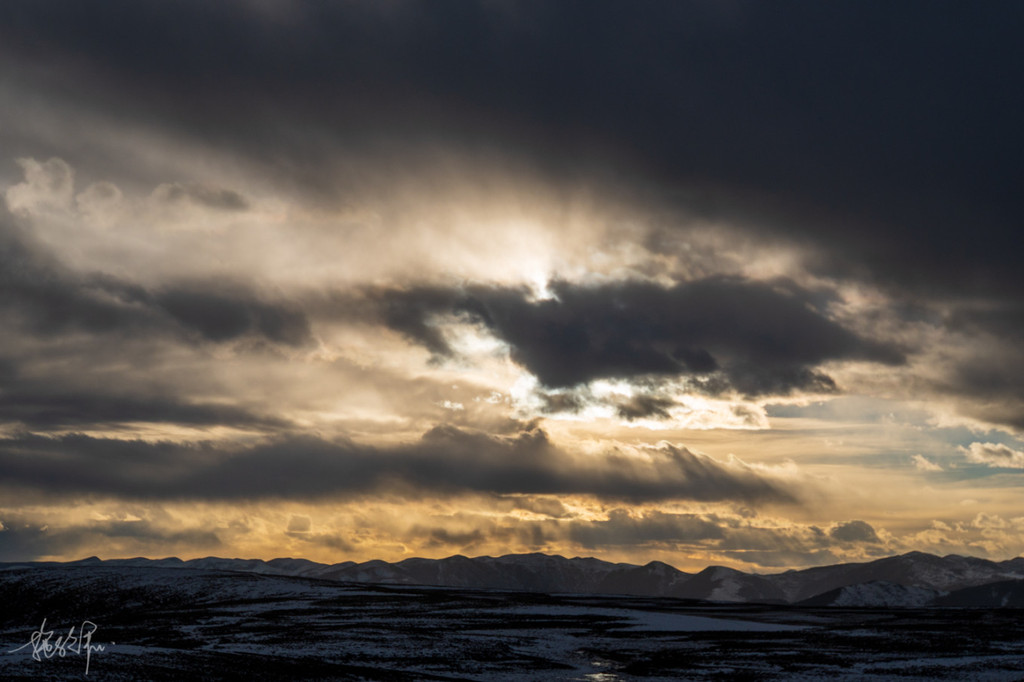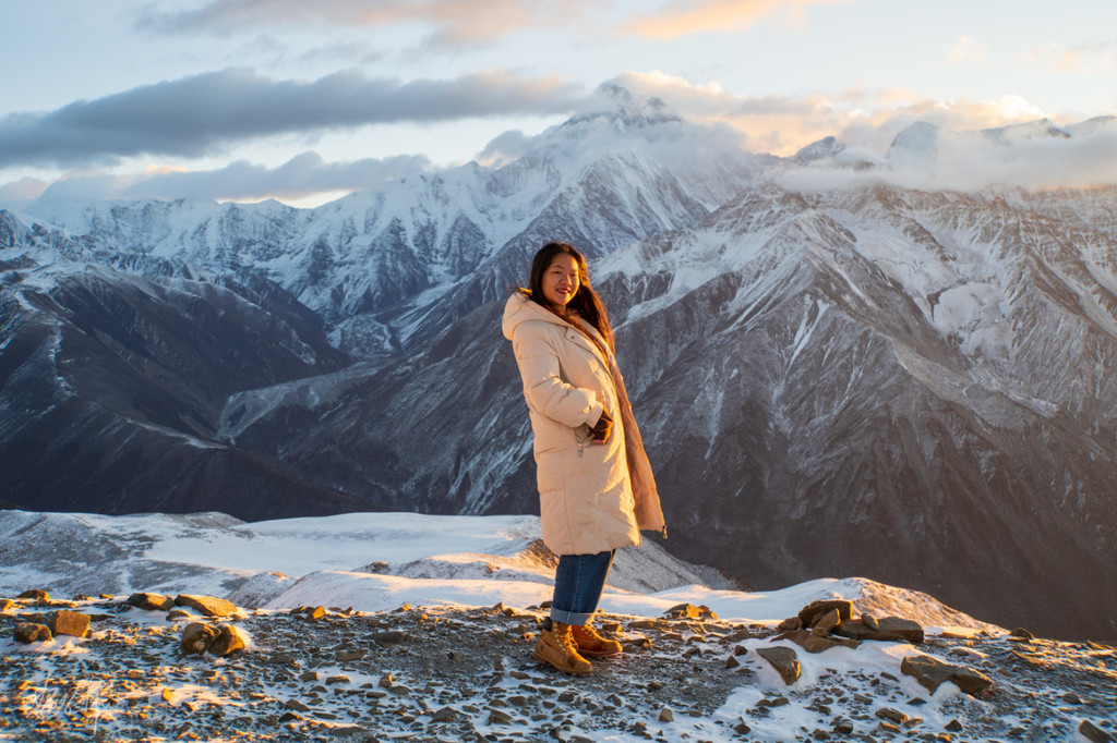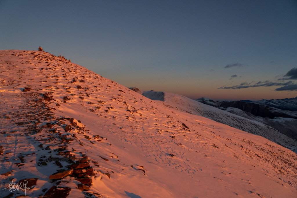 透过车窗,天朦朦亮,远处的 贡嘎 神山主峰也显现了出来,我们在天寒地冻的车里等待着日出。要知道我的鞋子昨天下午还整个浸在了雪地里,即便是标榜着户外靴不会进水,也抵挡不了雪从袜子端穿越进去,所以此刻我的脚甚至冻得失去了知觉,太冷了。