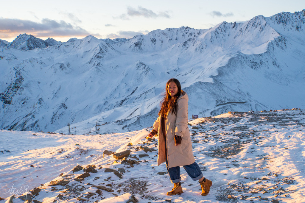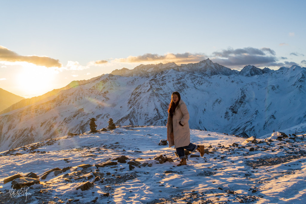 阳光渐渐染红了我们这一片的山头,冬日里的大雪覆盖了整个山体,雪路在太阳的照射下显得异常的美。从红色到金黄再到黄色、白色,这期间也不过半小时的时间,我和小娅抓紧时间互拍,我赶紧给她拍完了,告诉她构图,只要画面足够广,还是可以展示出不同的人与风景同框的画面。