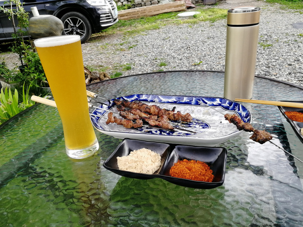 到了道孚,入住预定客栈,客栈是一个典型的道孚民居,全木结构,感觉非常不错,晚饭就在客栈小院里吃的烧烤,羊肉串、秋刀鱼、茄子,菜瓜,我们还喝了一杯扎啤。