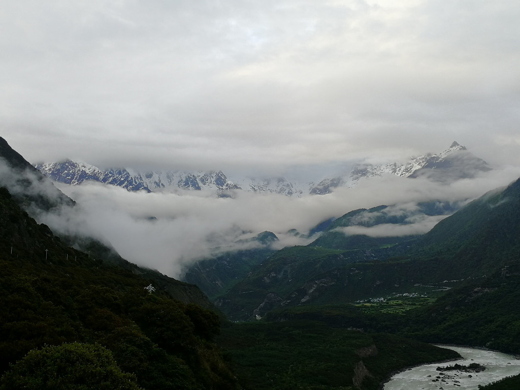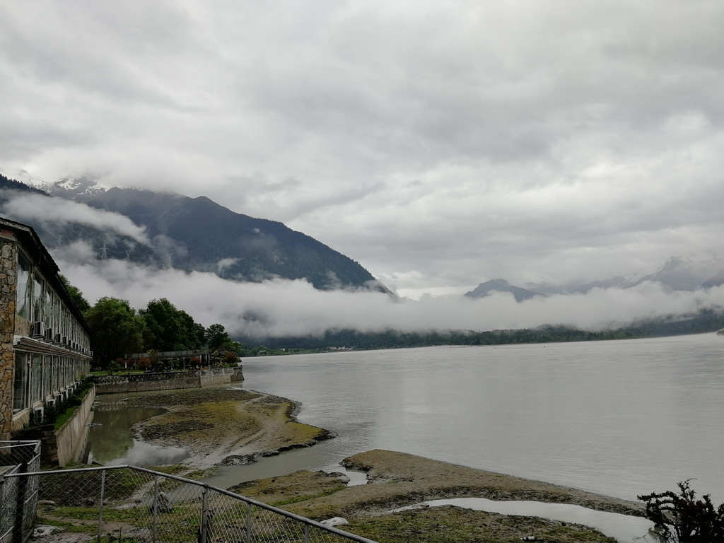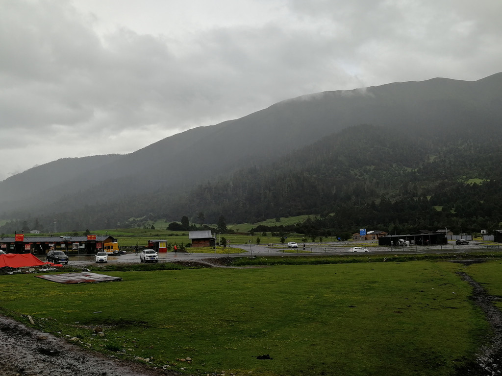 外面下着雨,我们慢吞吞地在店里吃着牦牛肉火锅,看来今天是看不到南迦巴瓦了,7点半我们从店里吃完火锅出来,这个时候雨停了,天还是雾蒙蒙的,我们在村里溜达了一会儿就回客栈了,打开房间门,透过落地窗看见南迦巴瓦居然露了点山尖尖出来,我们决定立刻开车沿着公路往山上开一段,果然前面还有一个很大的观景台,这个时候南迦巴瓦峰也慢慢露出了轮廓,虽然不是很多,但总比没有强。
