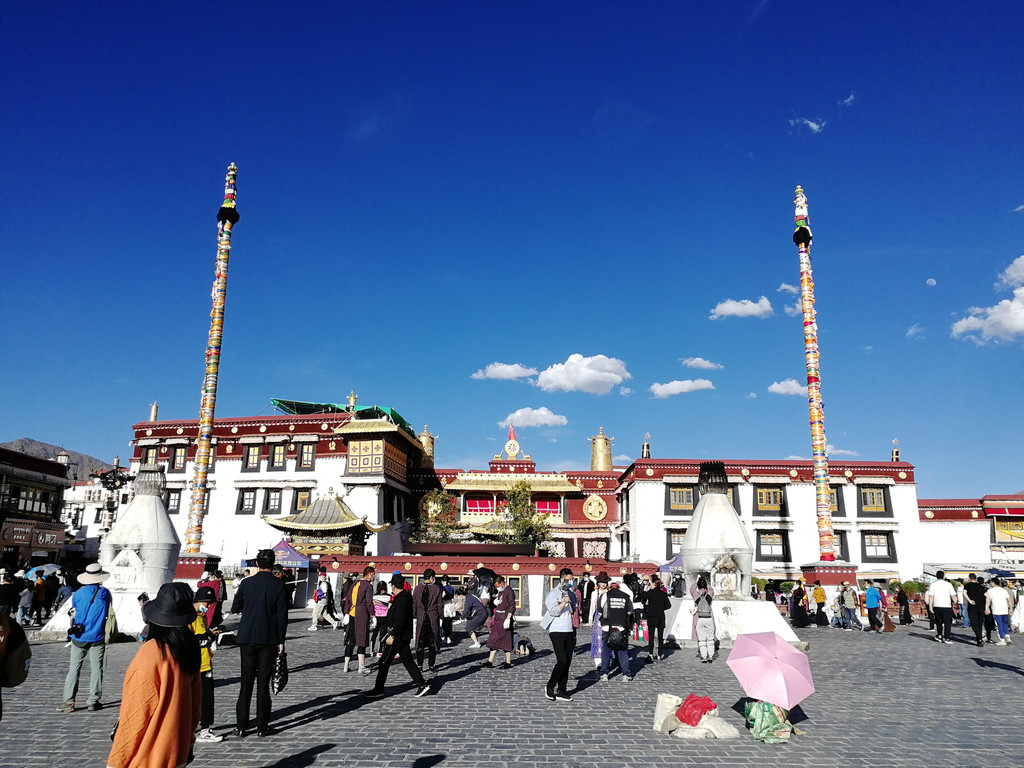 游完布达拉宫,杨公子要去八廓街。八廓街就是一个商业街,我不是很感兴趣,但杨公子非要去打卡一下。我们从布达拉宫步行到八廓街,逛了逛。八廓街紧挨着大昭寺,我们走在八廓街的外围,也等于围着大昭寺转了大半圈,路上很多信徒在膜拜大昭寺。