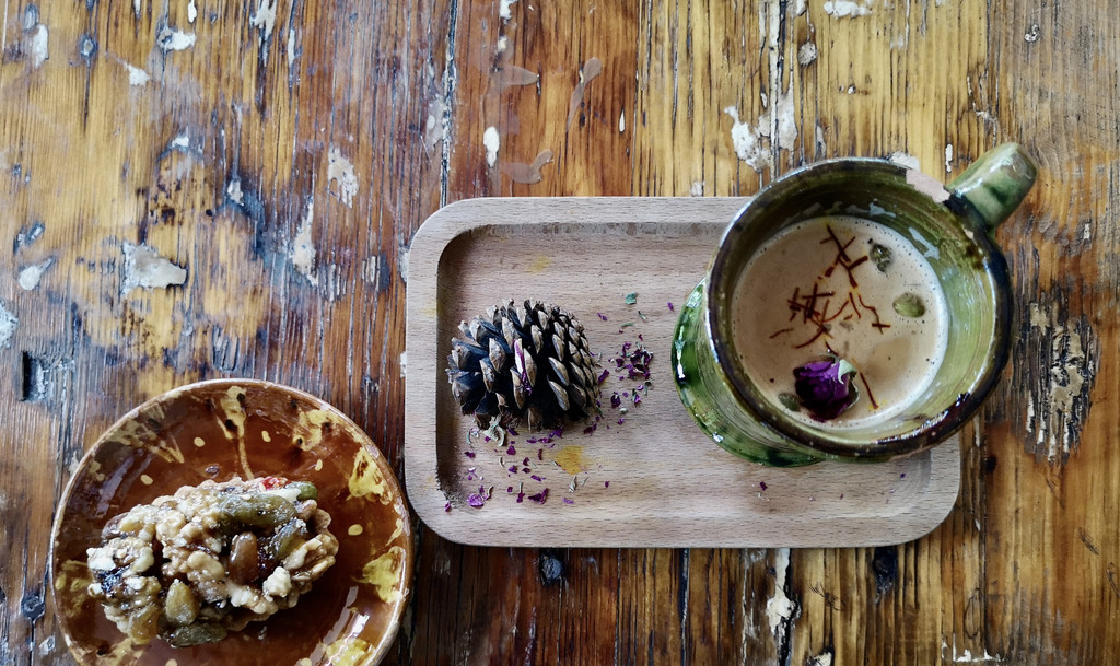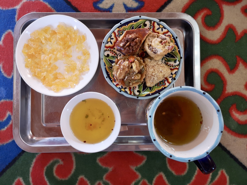 喀什百年特色茶:是用17种原料配置的茶,其中包括藏红花、豆蔻等有药用价值的植物。为了让原材料充分发挥作用,所以这种茶要稍微煮一下,放入用藏红花熬制的糖,再倒入买买提大叔自制的百年特色茶,茶汤呈金黄色。