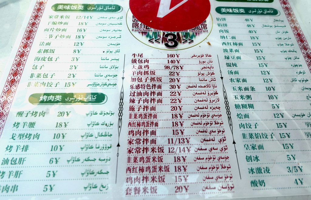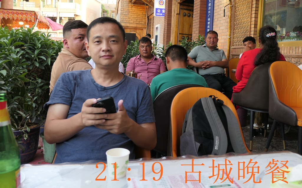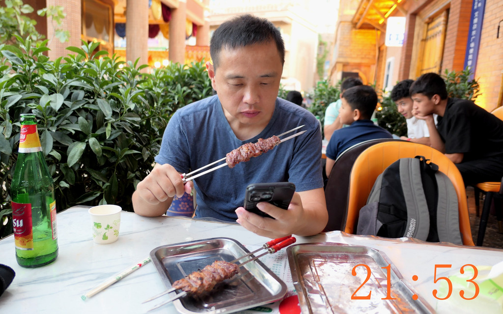 晚餐就选择警务站旁边的一家维吾尔族把子面馆。这家店铺生意火爆,可上菜速度也是奇慢,一顿饭吃了近一小时,大半时间都耗费于等待上菜。记得是吃了啤酒、酸奶、拌面,还有啥记不清了,反正是吃到最后的烤羊肉串上桌,已经是21点50分。