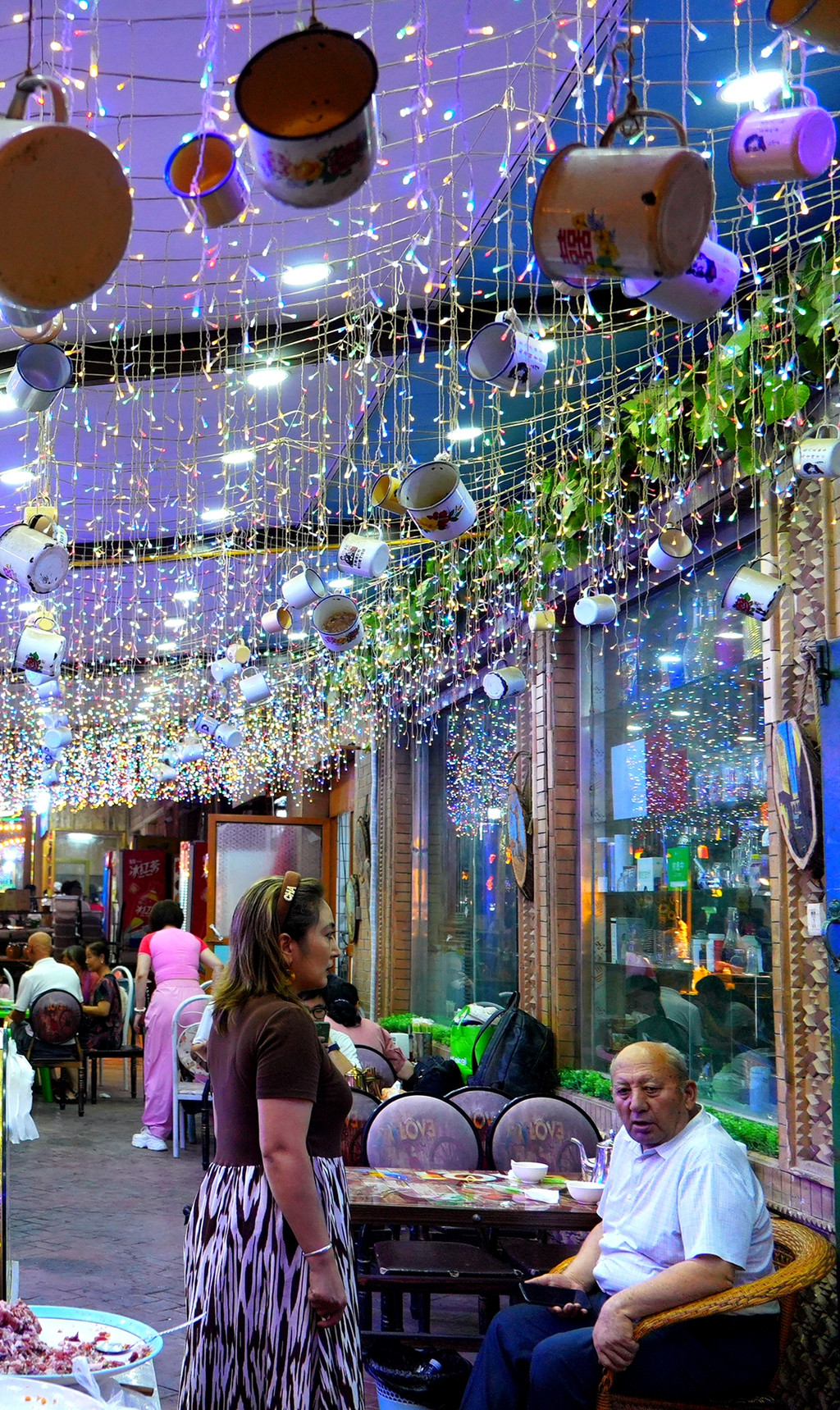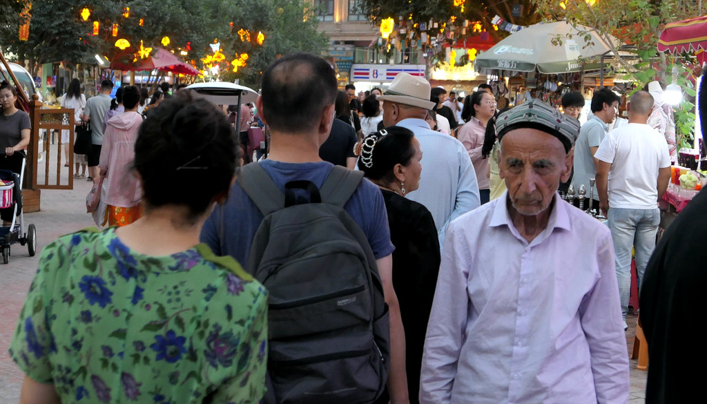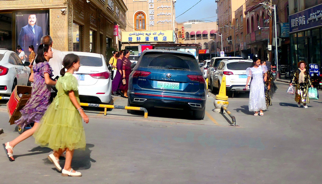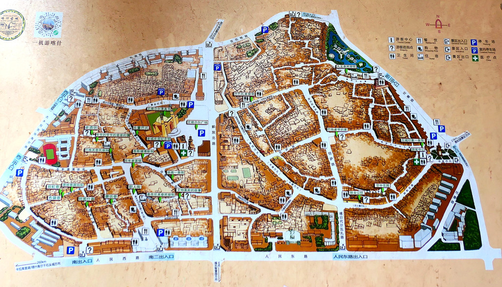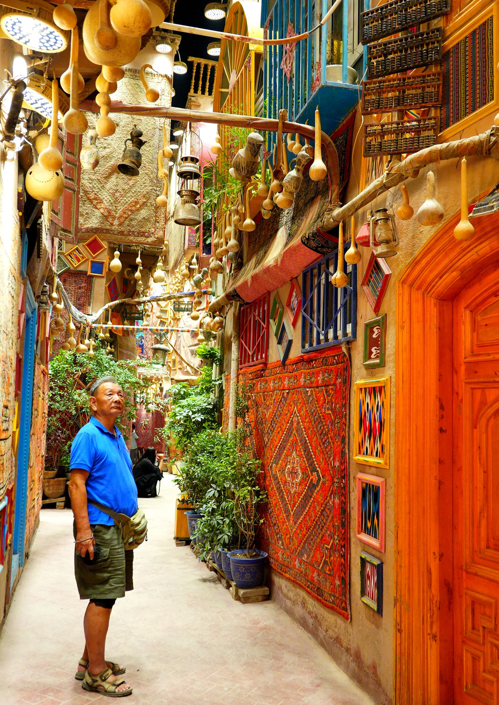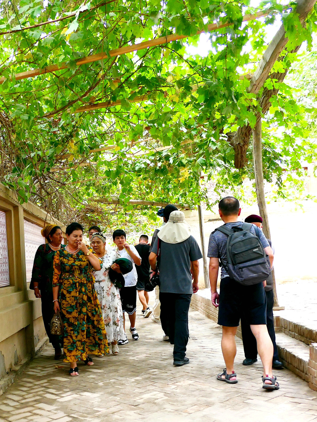 此番来新疆,X.J.只是提前一周才让我准备一个12天的行程方案。由于时间紧迫,我匆忙赶制的方案仅能勾勒出每日时间安排、行车路线、景点及住宿。至于各景点的游览细节,则是无暇细究,只能到时候再随机应变,跟着感觉走。喀什古城亦是如此,我们事先仅知古城分东、西两区,但对两城区内各有何景点,却是一无所知。因而,饭后我们就只能在古城(西区),选择人多热闹的去处,随便走走看看。