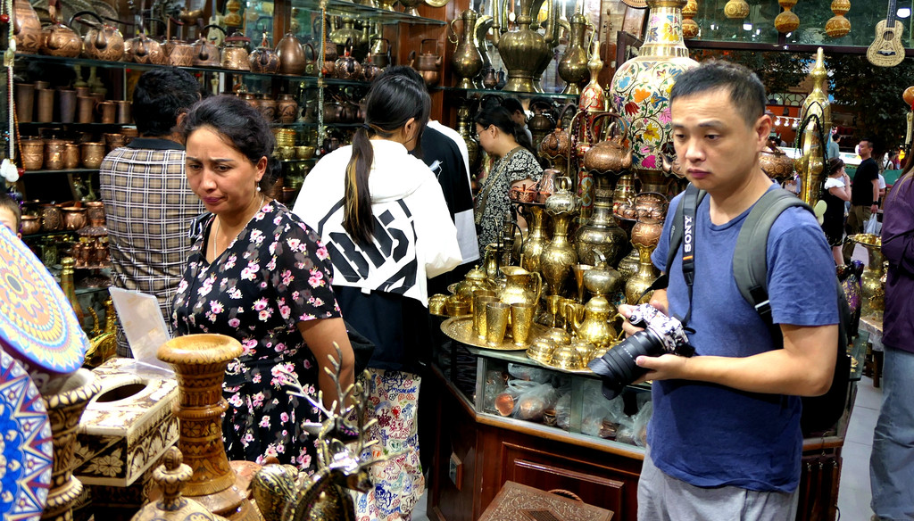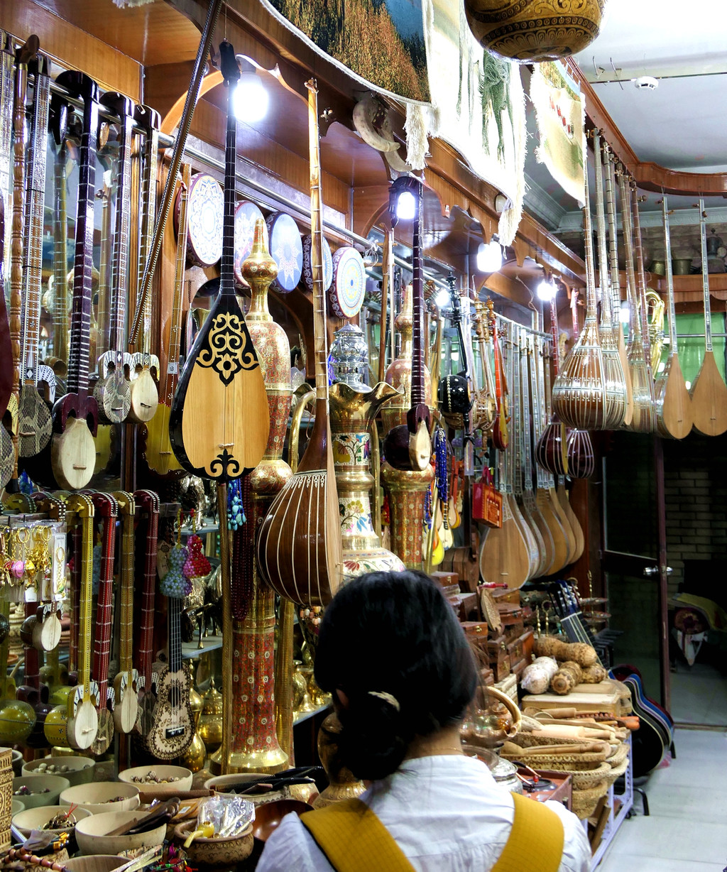 如今,古街变身成为手工艺品一条街,当地众多顶尖能工巧匠均汇聚于此。维吾尔民间乐器的著名世家、喀什最大的铜器世家等,也都在此开设作坊。各式手工艺品琳琅满目,让人目不暇接。