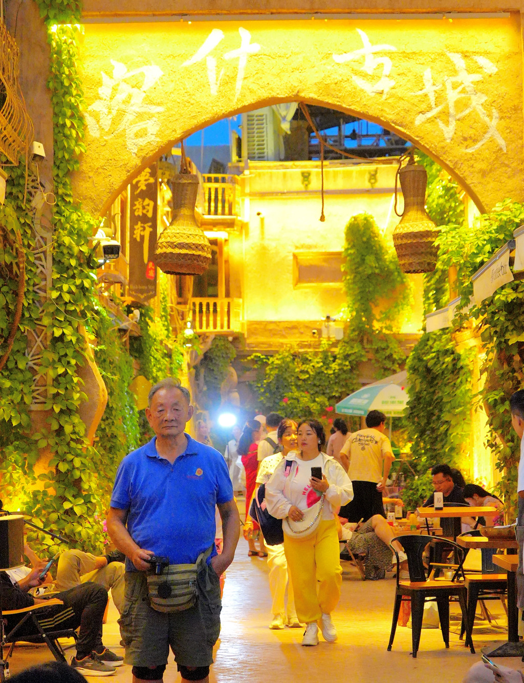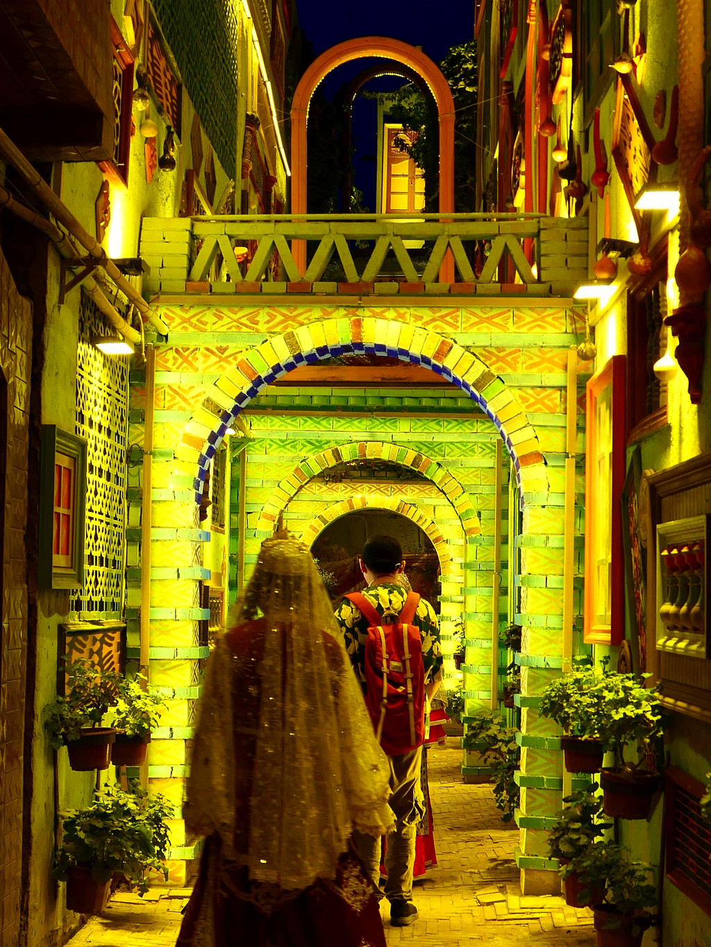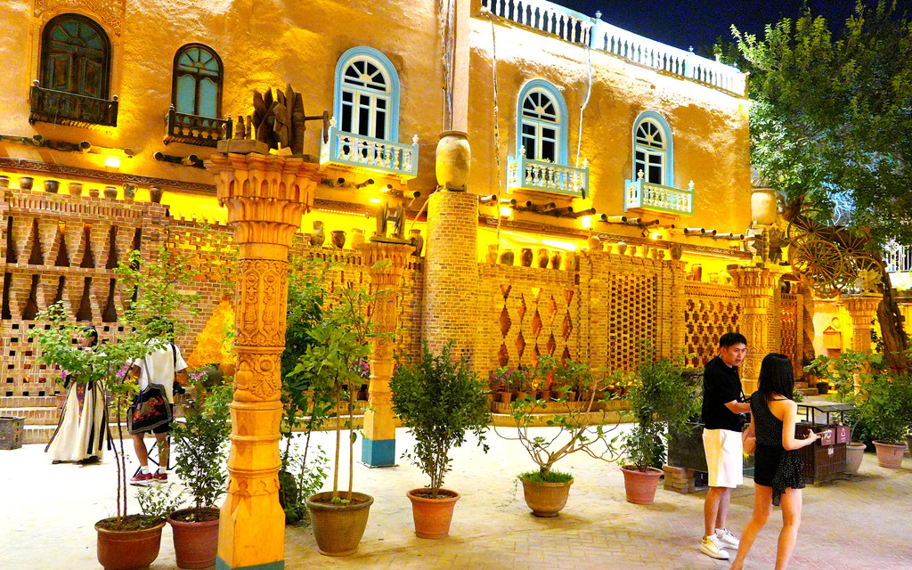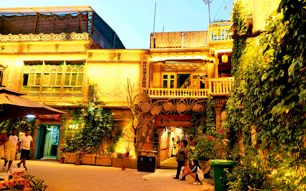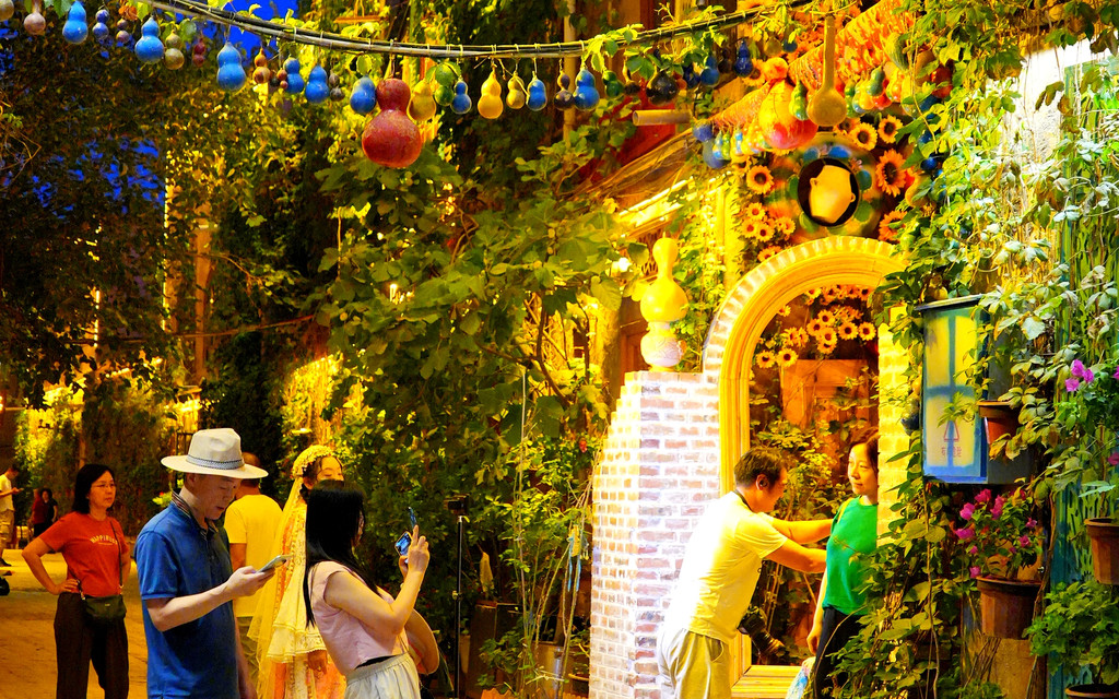 华灯初上,喀什古城仿佛是被梦幻的画笔轻轻勾勒。光影交错间,民居窗前、壁下的砖雕与镌刻工艺清晰可见,无声诉说着当地人传承千年的审美意趣与生活智慧。古城居民酷爱种植花草,橘黄色的灯光倾洒在古老街道上,与街边墙角的绿意交相辉映,又使古城的夜色显得更加迷人。