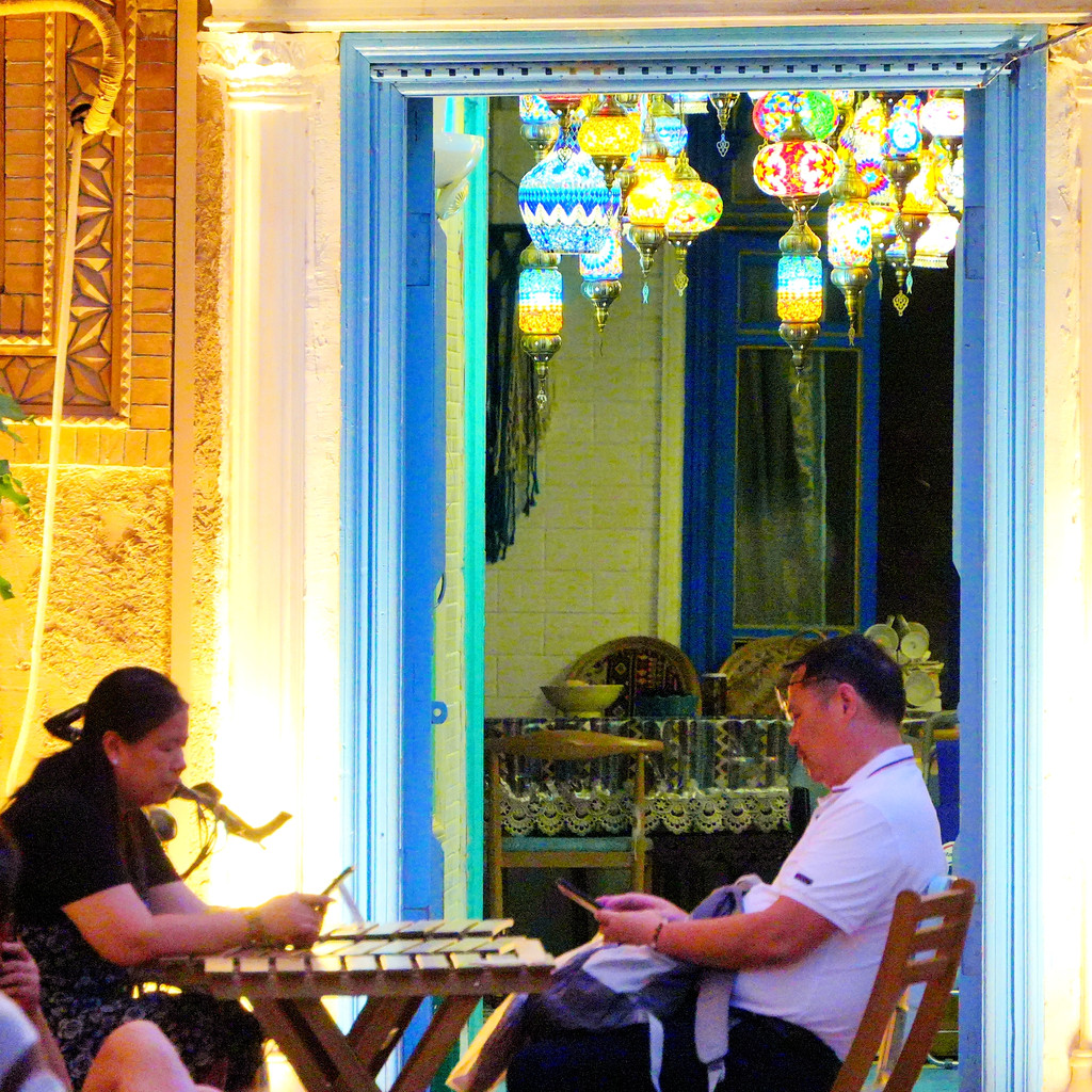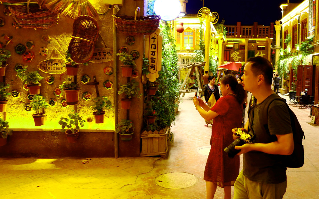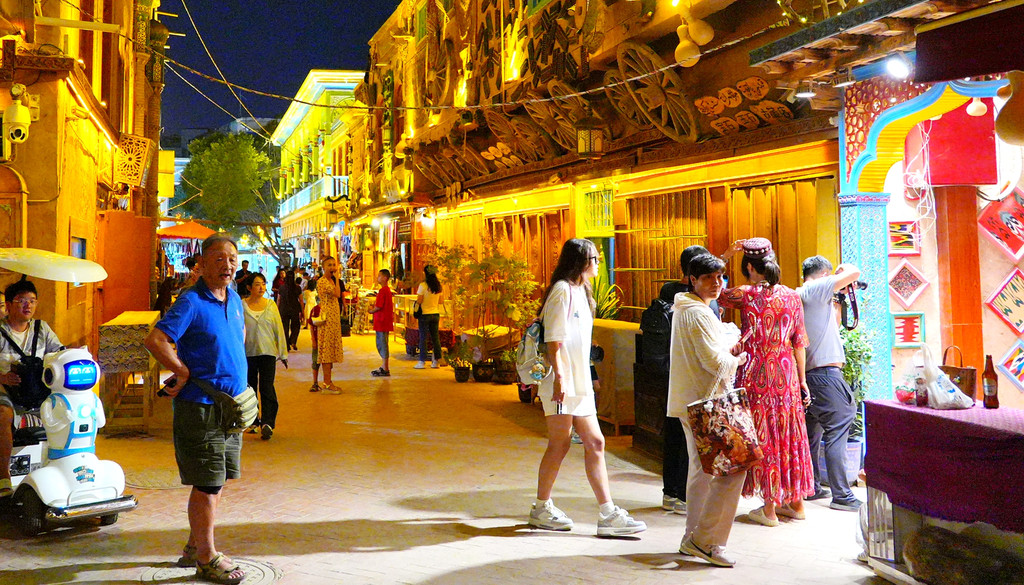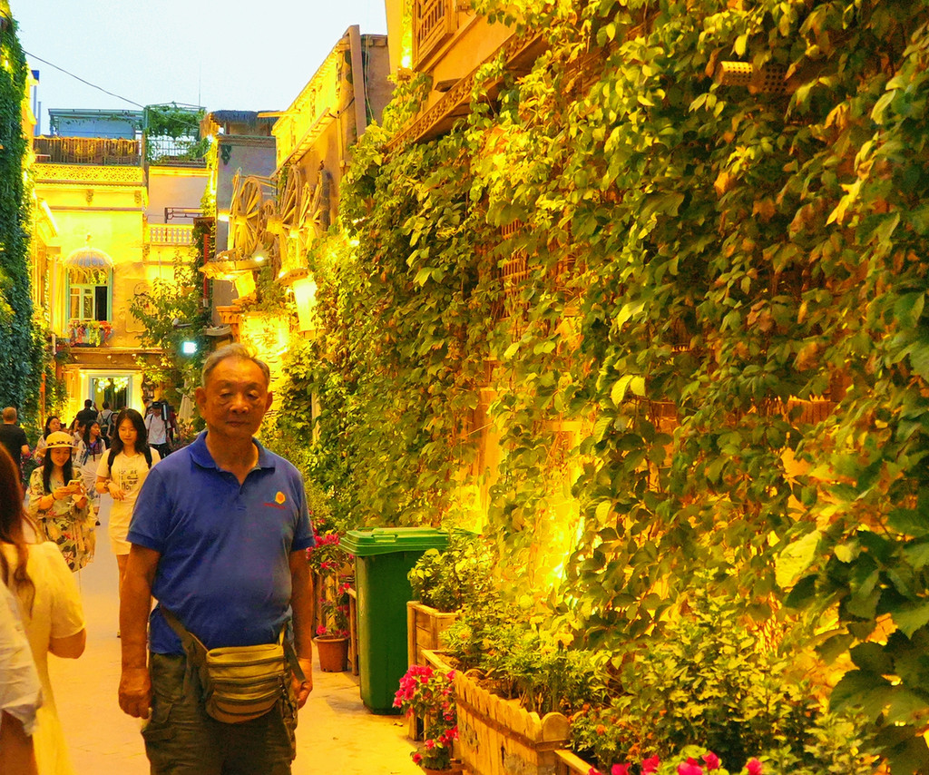 华灯初上,喀什古城仿佛是被梦幻的画笔轻轻勾勒。光影交错间,民居窗前、壁下的砖雕与镌刻工艺清晰可见,无声诉说着当地人传承千年的审美意趣与生活智慧。古城居民酷爱种植花草,橘黄色的灯光倾洒在古老街道上,与街边墙角的绿意交相辉映,又使古城的夜色显得更加迷人。
