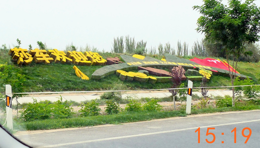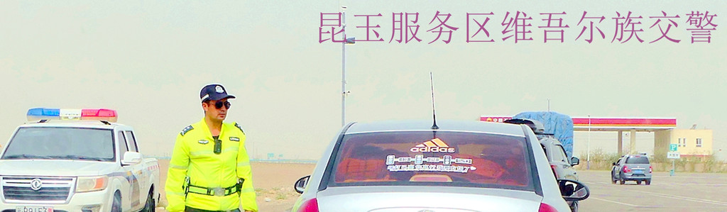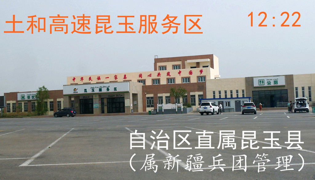 12:17驶经昆玉服务区,我们本来并不打算停车,但公路设置了路障,逼迫我们绕道进入服务区。进去后有交警拦车,只说一句“小心驾驶”就立马放行。也就是说,强迫进入服务区就只是为了提醒注意安全。新疆的公路既平又直,稍不注意就会超速,路面上又常有流沙,经常被人提醒也是有利无弊。