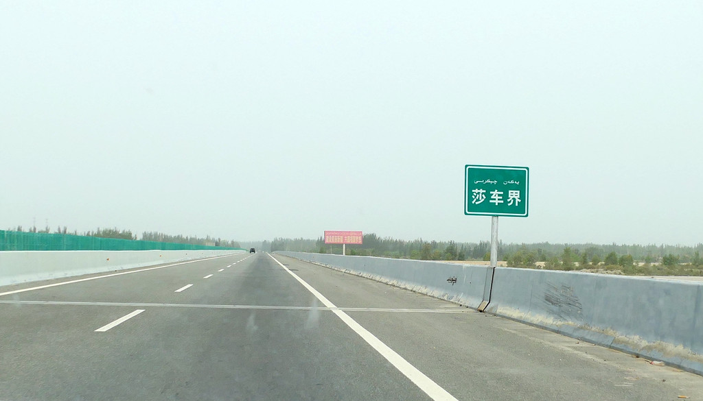 昆玉归属新疆建设兵团管辖,它也是新疆维吾尔自治区的直辖市。刚出服务区就看到“皮山界”的标志,我们进入了皮山县境内。13:00在荒漠地域遇到风沙天气,路面上到处都是飞沙,前面的汽车带起沙尘旋转、升腾,就好像是刮起旋风一般。13:22遇到沙漠中难得之小雨,飞沙因雨水而终结,13:25小雨变成为大雨,但过没多久雨又停了。荒漠里的天气真是变幻莫测。