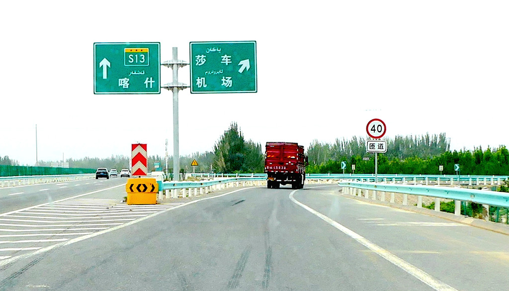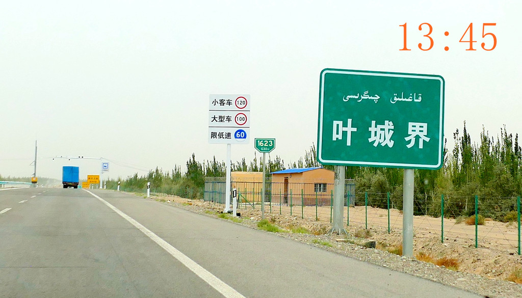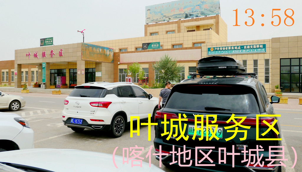 13:45,“叶城界”的标志映入眼帘,这表明我们已驶入喀什地区叶城县。8分钟后,前方又有路障,车辆再次被强制引入“叶城服务区”。起初,我们还以为又是有交警要提醒安全驾驶,可驶入服务区后却是不见交警踪影,这才明白,设置路障只是为了引导车辆稍作停留而已。其实,刚过叶城界不久,我们就曾留意到一块路边提示牌,上面写着“长时间驾车疲劳辛苦,可进入服务区休息20分钟再走”。