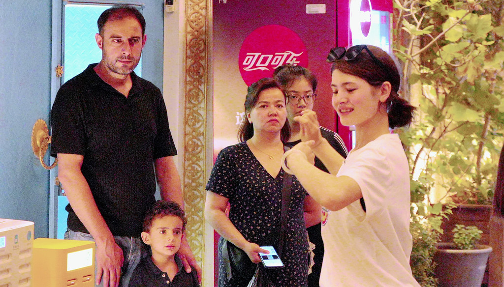 原以为会碰壁,但开门的维吾尔族民警却是意外地友善。他解释说,此处无法办理,办理点在广场对面的便民警务站。话音刚落,就有一位民警主动说他也要去那一带附近,可以顺路带我们一程。途中,他指着广场对面的塔形建筑,告知警务站就在塔下,随后便与我们道别,让我们自行前往。