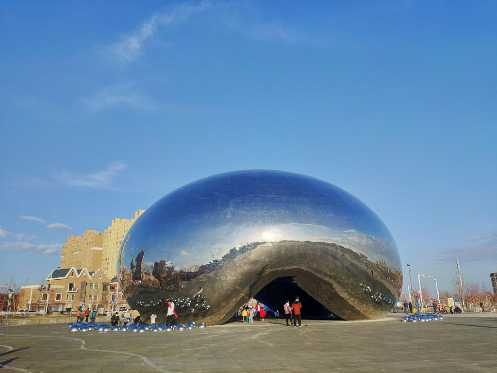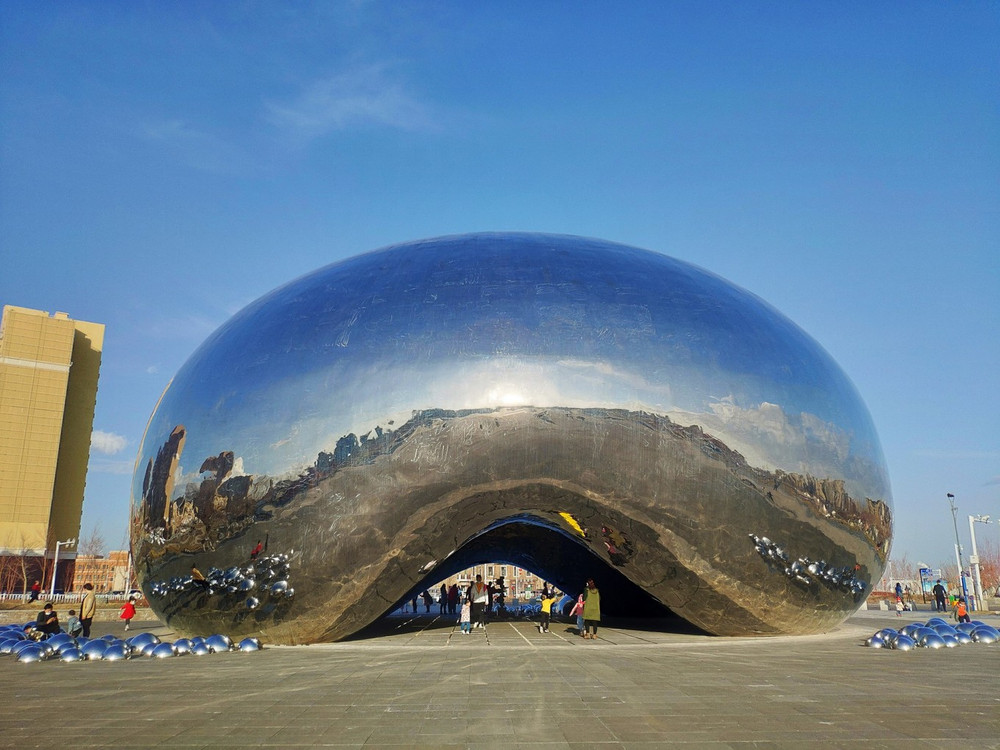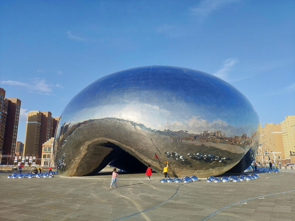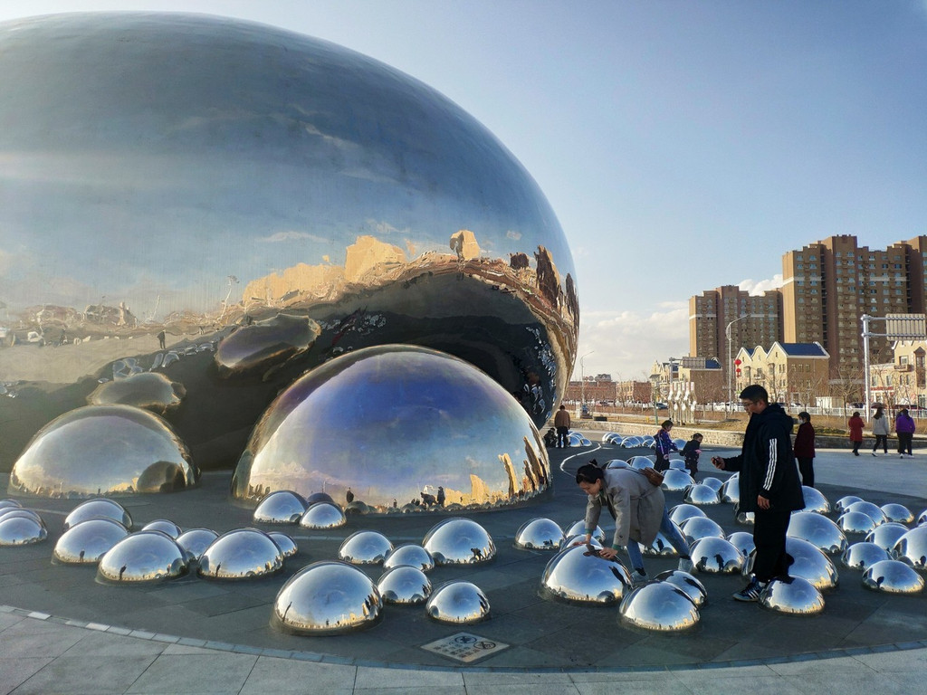 这里的雕塑主体就是这滴大石油,是被抽象成了有4个圆脚中部底下留空间的硕大油滴。大油滴周边还围着几群小油滴,有大有小,小朋友穿梭其间游玩,好不热闹。大小油滴都是采用光亮镜面,看着有点像水银的质地,特别好看。