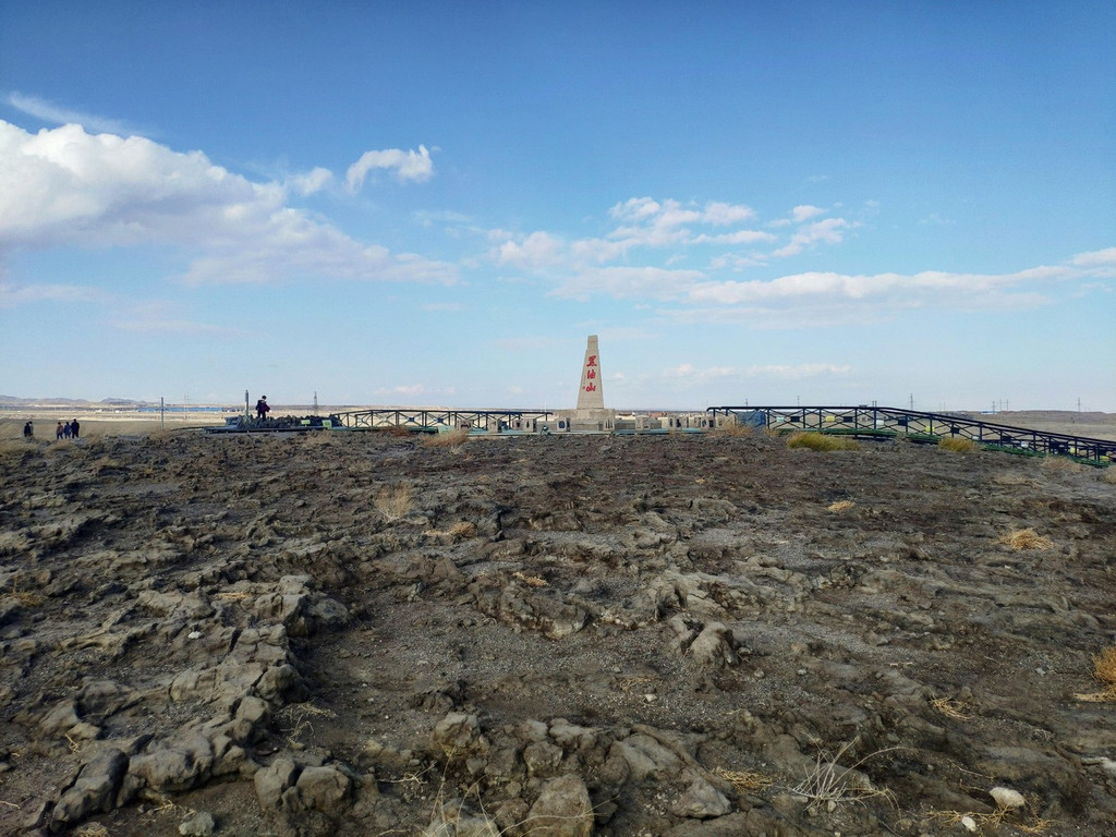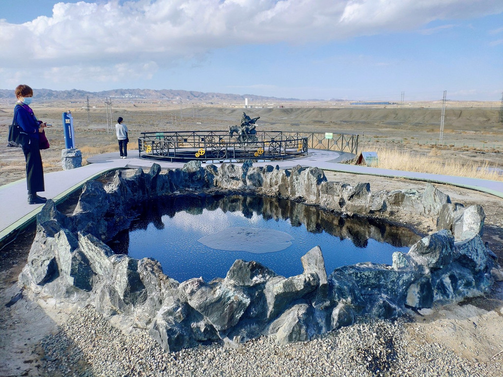 景区最高点,就是这块三角锥型的石碑,上面写着黑油山。这里环顾四周,苍茫大地,散步多口石油池,这是石油城先辈们奉献了一辈子的热土啊。看着大人带着小朋友在景区参观,小朋友嬉笑玩闹,跟这片荒漠构成了强烈的对比。