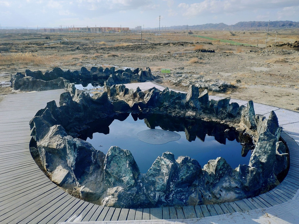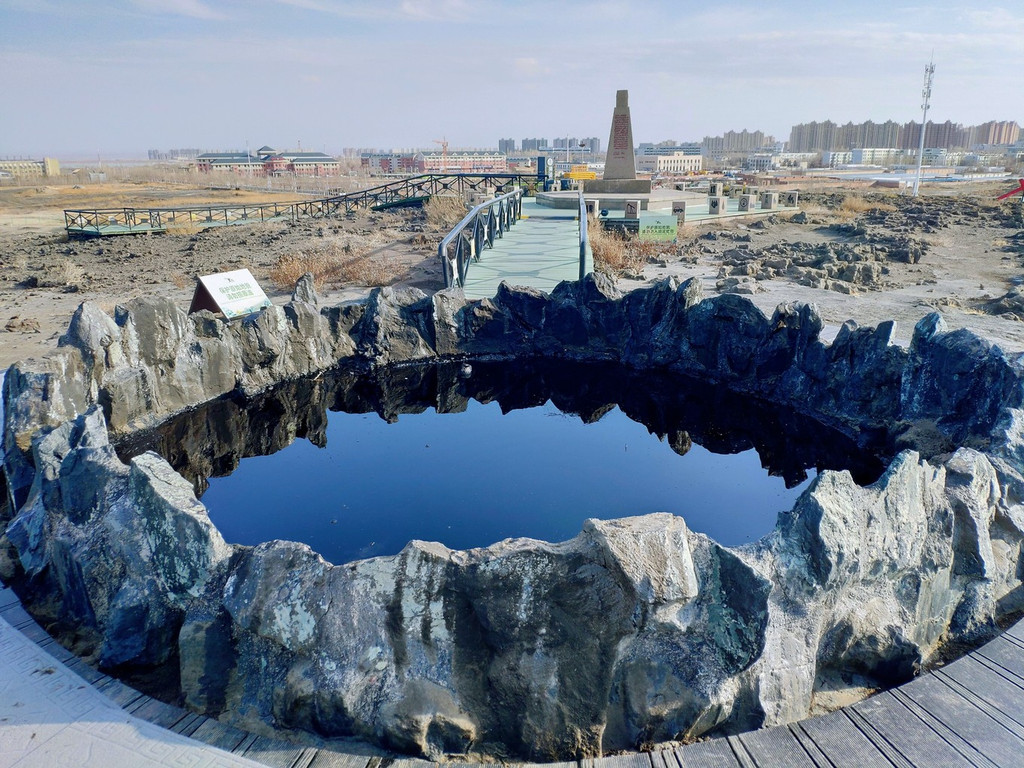 真的,进入景区就有很明显的感觉,如果这里不是因为有石油,真的就是一片无人问津的荒漠啊!在草都几乎不怎么生长的荒漠上,看到了石油池,有些有用水泥砖垒起来,有些就用黑石块垒成一圈,看着比较原始。黑油真的黑得发亮,有些还会冒泡!石油气味走进了才闻得到。