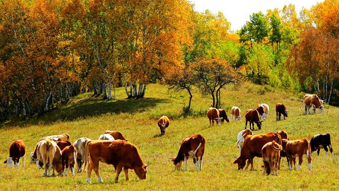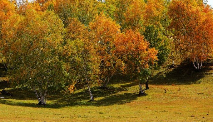 乌兰布统的秋天,是大自然奉送的美丽,是那种浓得化不开的艳美,是那种厚得有点沉重的滋味。每年从9月到10月上旬,树叶开始大量地变色,这期间,各种树木的叶子,有的金黄、火红、翠绿,五彩缤纷。特别是白桦树的叶子。成群的牛羊,在夕阳的映照下,如同撒落在草原的珍珠。